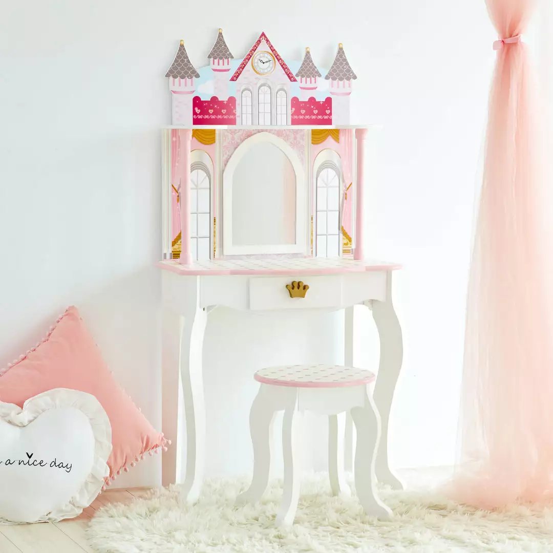 - KIDS VANITY SET: Features a pink and white castle design with towers, columns, and a rooftop area for a fun and functional addition to your child’s bedroom or play area