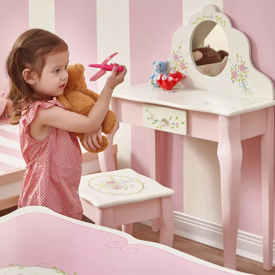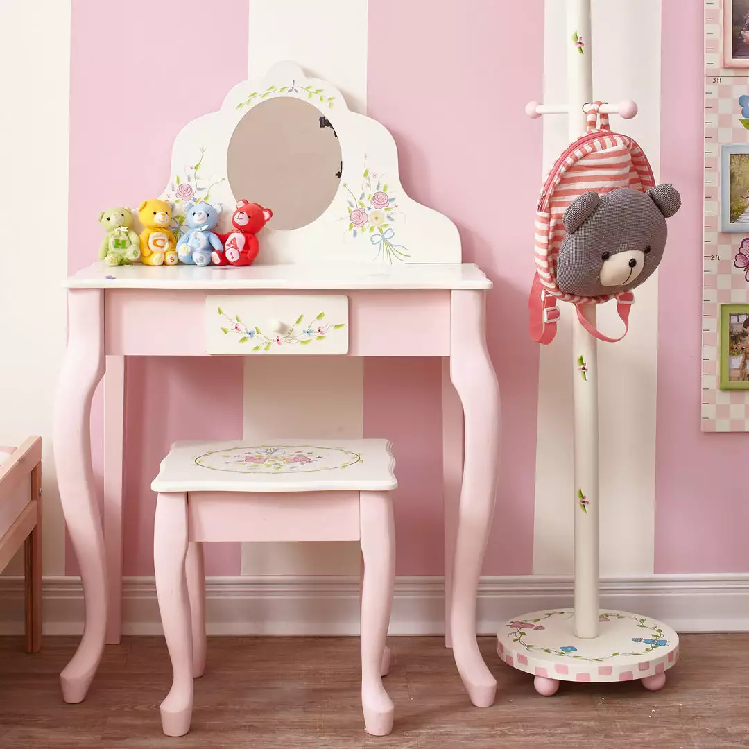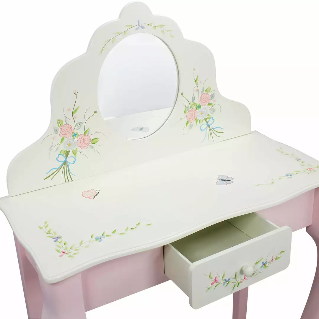 Vibrant, pink, and white, and girlie all over! The Bouquet Vanity Table and Stool Set is the perfect place to make her dress-up dreams a reality. Equipped with storage and a mirror, this make-believe makeup vanity for children is entertaining, fosters creativity, and encourages safe play. Made from solid wood, this durable pink and white vanity and stool are suitable for children 3 years and older.