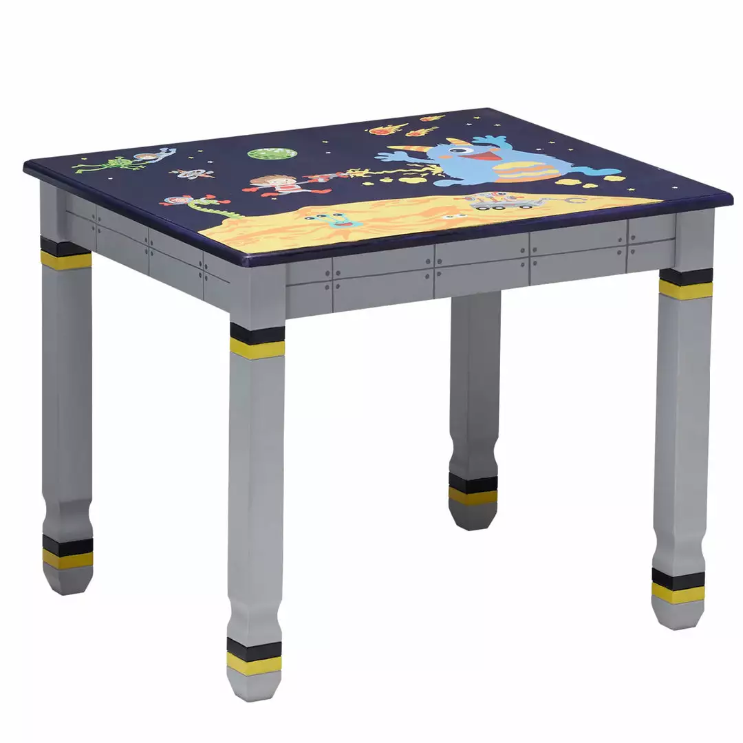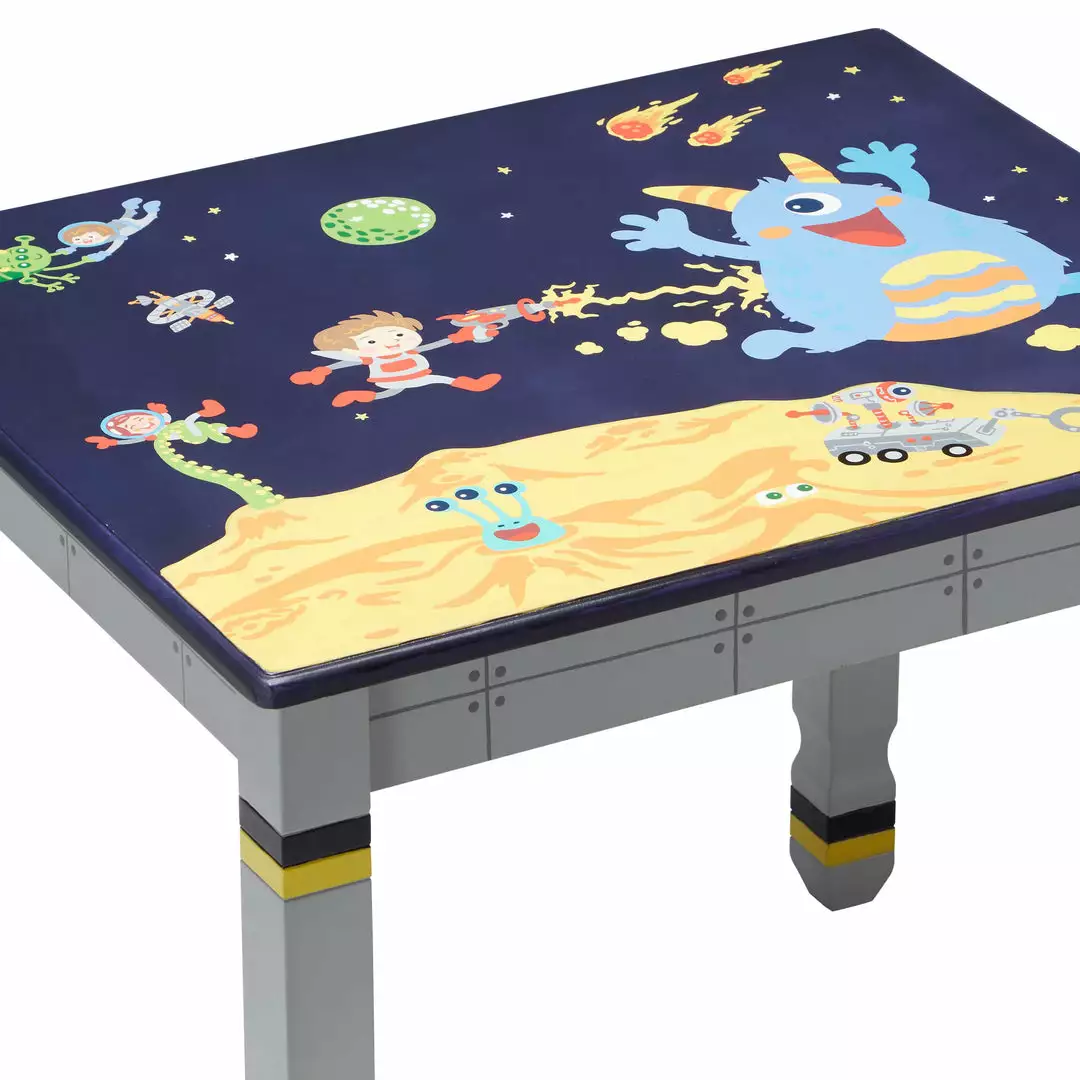 Get eco-friendly with our hand-painted and hand-carved planet inspired and star speckled table from the Outer Space Collection. Twinkling yellow and white stars adorn this deep blue table with asteroids. space creatures. and rocket ships floating about its design.