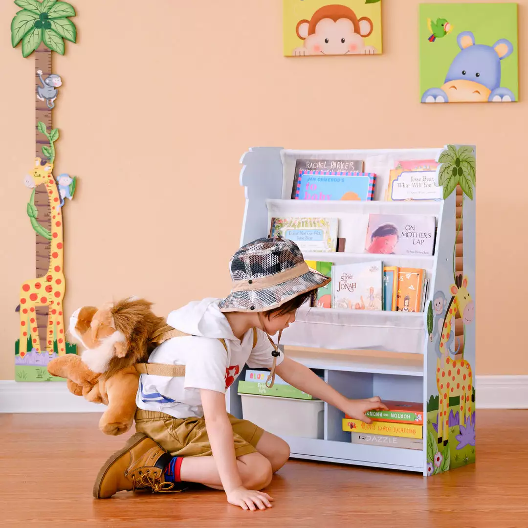 - KIDS BOOKSHELF: Decorated with a fun display featuring friendly jungle creatures for a whimsical playroom storage solution