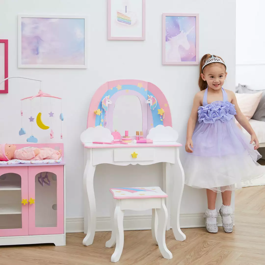 Give your little one a magical place to get ready with the Fantasy Fields by Teamson Kids Little Dreamer Vanity Table with Stool. This whimsical vanity set features a rainbow unicorn design with pink and purple accents for a fun and functional addition to your child’s bedroom or play area. This kids vanity set includes an arch-shaped mirror and coordinating stool to make getting ready easy. The three built-in drawers and star & unicorn shaped hanging hooks on the mirror provide plenty of storage space for makeup, brushes, jewelry, and other accessories. The durable MDF construction with rounded corners is kid-safe and easy to wipe clean from every day messes, and the unbreakable plexiglass mirror provides better reflection and long-lasting use. The easy-to-follow instructions allow for quick adult assembly so playtime can start right away. This kid-sized vanity table measures 23.5″ long, 11.75″ deep, and 38.5″ tall and the stool measures 11.5″ long 11.5″ deep, and 13.75″ tall to fit in any playroom. Recommended for children ages 3 years and up.