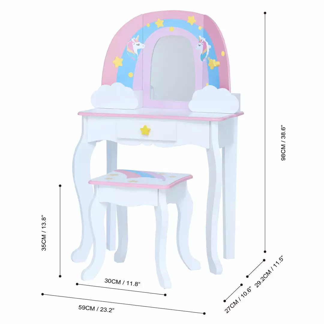 - KIDS VANITY TABLE: Features a rainbow unicorn design with pink and purple accents for a fun and functional addition to your child’s bedroom or play area