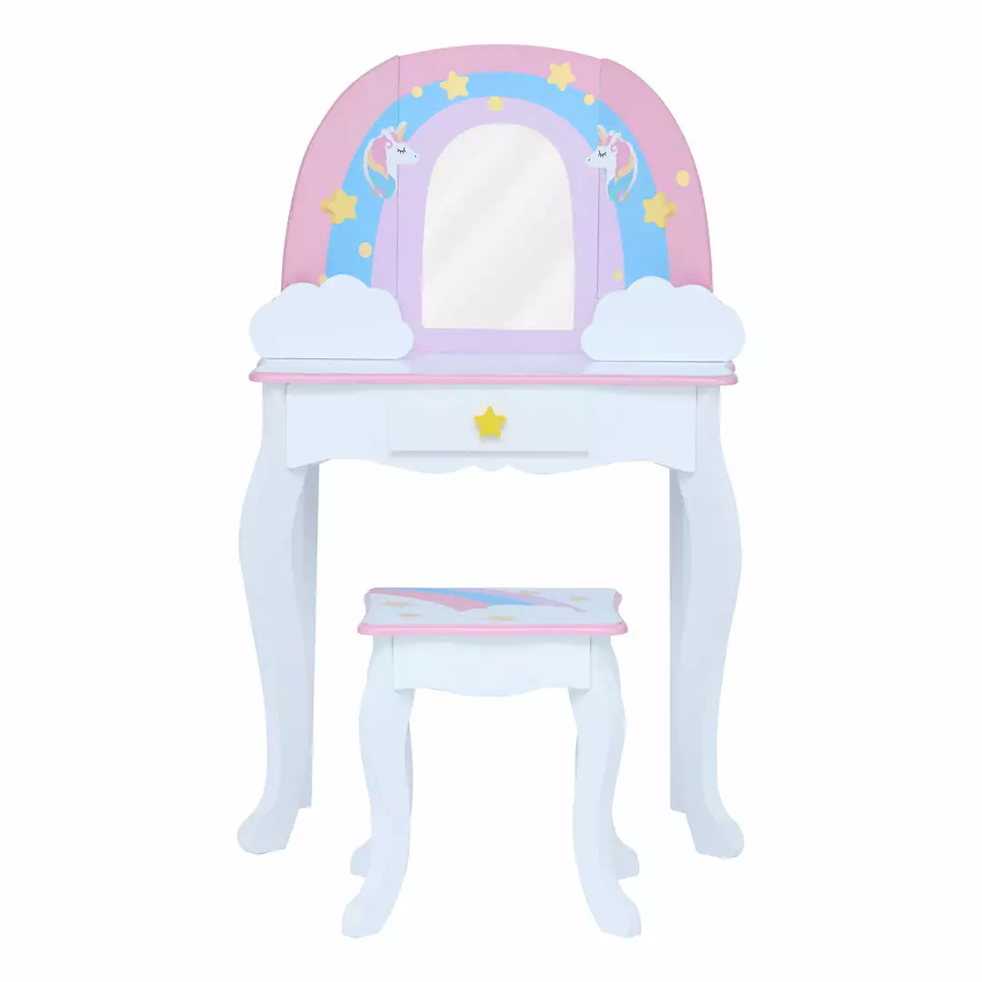 Fantasy Fields Little Dreamer Rainbow Unicorn Vanity Table Set with Mirror and Stool, White