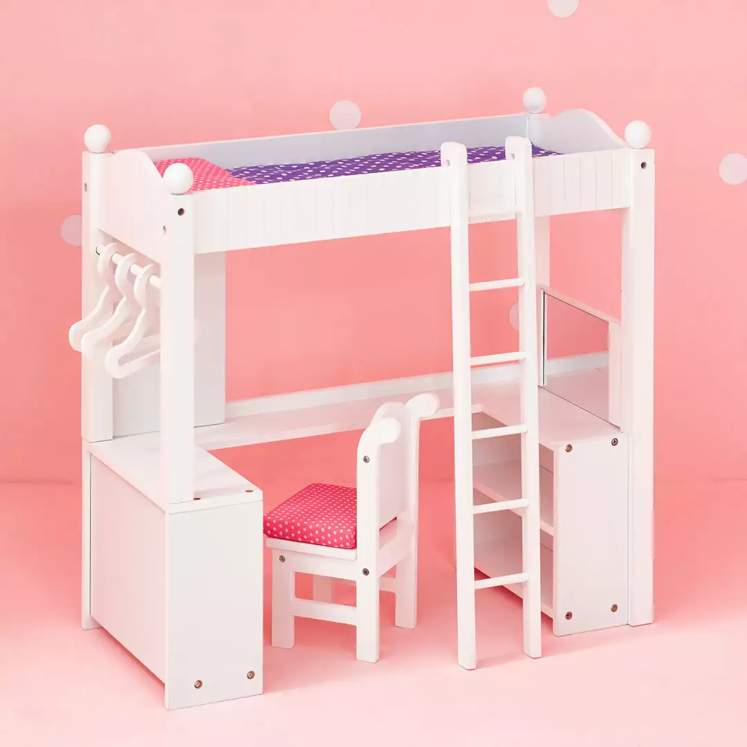 Bring fun, functional design to your child’s doll dorm room with the Olivia’s Little World Little Princess Double Bunk Desk for 18″ Dolls. Featuring a study area with a ladder up to a cozy bed, this bunk desk provides your little one’s dolls with place to catch up on homework and a comfortable resting place for when the lights go out. This adorable toy bunk bed features a classic white finish with a purple polka-dot comforter and a pink polka-dot pillow for a fun pop of color in your child’s bedroom or play area. Equipped with a headboard and footboard for the top bunk, a ladder connecting the bunk and desk, a vanity mirror, and a closet area with hangers, this toy bed has everything necessary to keep your child’s dolls comfortable and organized. Constructed of eco-friendly MDF, this sturdy doll bed is designed for long-lasting and is easy to wipe clean for every day messes. Included with the toy bunk bed are step-by-step instructions for quick and easy assembly. The Olivia’s Little World Little Princess Double Bunk Desk measures 21″ x 10″ x 21″ and is recommended for children ages 3 years and up.