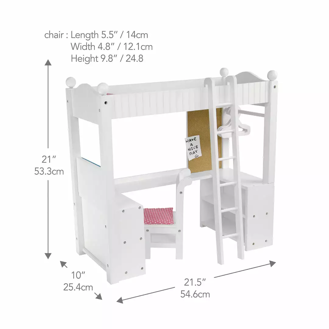- KID-SIZED DIMENSIONS: Doll bunk desk measures 21″ x 10″ x 21″ to fit in any play area, is compatible with dolls up to 18″ tall, and is recommended for children ages 3 years and up