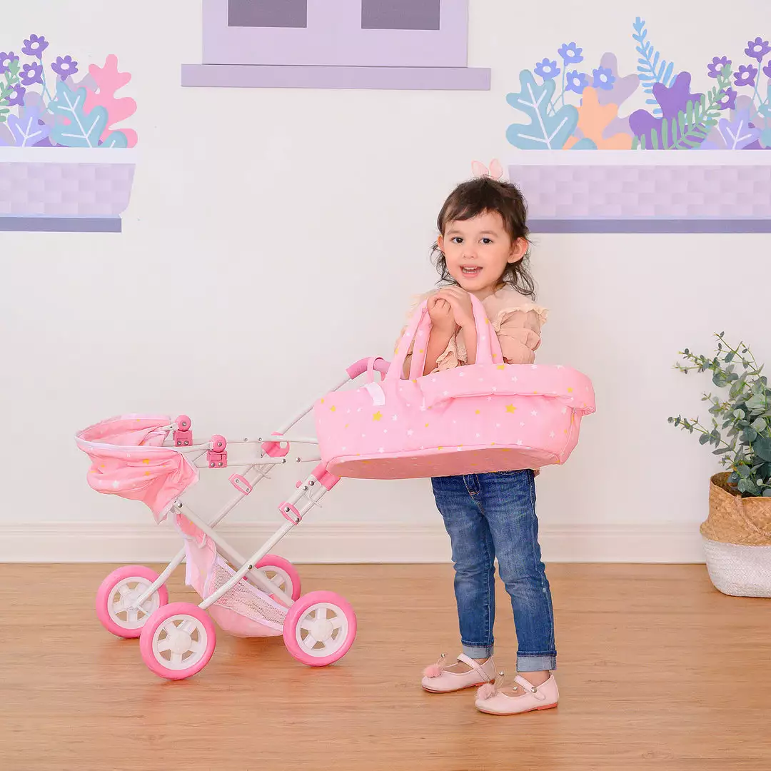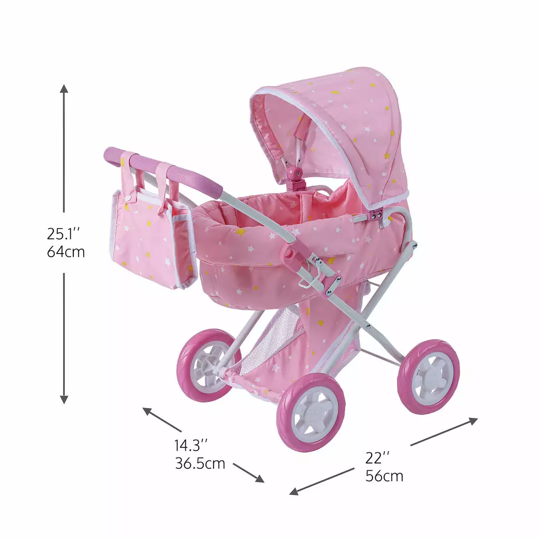 Keep your child’s dolls secure when on the go with the Olivia’s Little World Twinkle Stars Princess Deluxe Doll Stroller. This colorful baby doll stroller is features a pink seat and canopy covered in white and gold stars to keep your little one’s dolls and figurines protected from the elements while outdoors. The multiple configurations of this stroller functions both as a foldable stroller and as a hand baby carrier for versatile use. A large storage basket under the seat provides ample space for any bottles or other baby doll supplies to make playtime more convenient. The toy baby carrier’s foldable construction allows for quick setup and easy storage when playtime is over to avoid a cluttered play area. Add this baby doll stroller to your child’s toy collection alone or with other items from the Twinkle Star Princess collection to make playtime more magical. This durable stroller features large wheels for easy steering and is suitable for 16″ to 18″ dolls. Measuring just 22″ x 14.5″ x 26.75″, this toy stroller keeps your child’s dolls mobile without taking up too much space. The Olivia’s Little World Twinkle Stars Princess Deluxe Baby Doll Stroller is recommended for children ages 3 years and older.