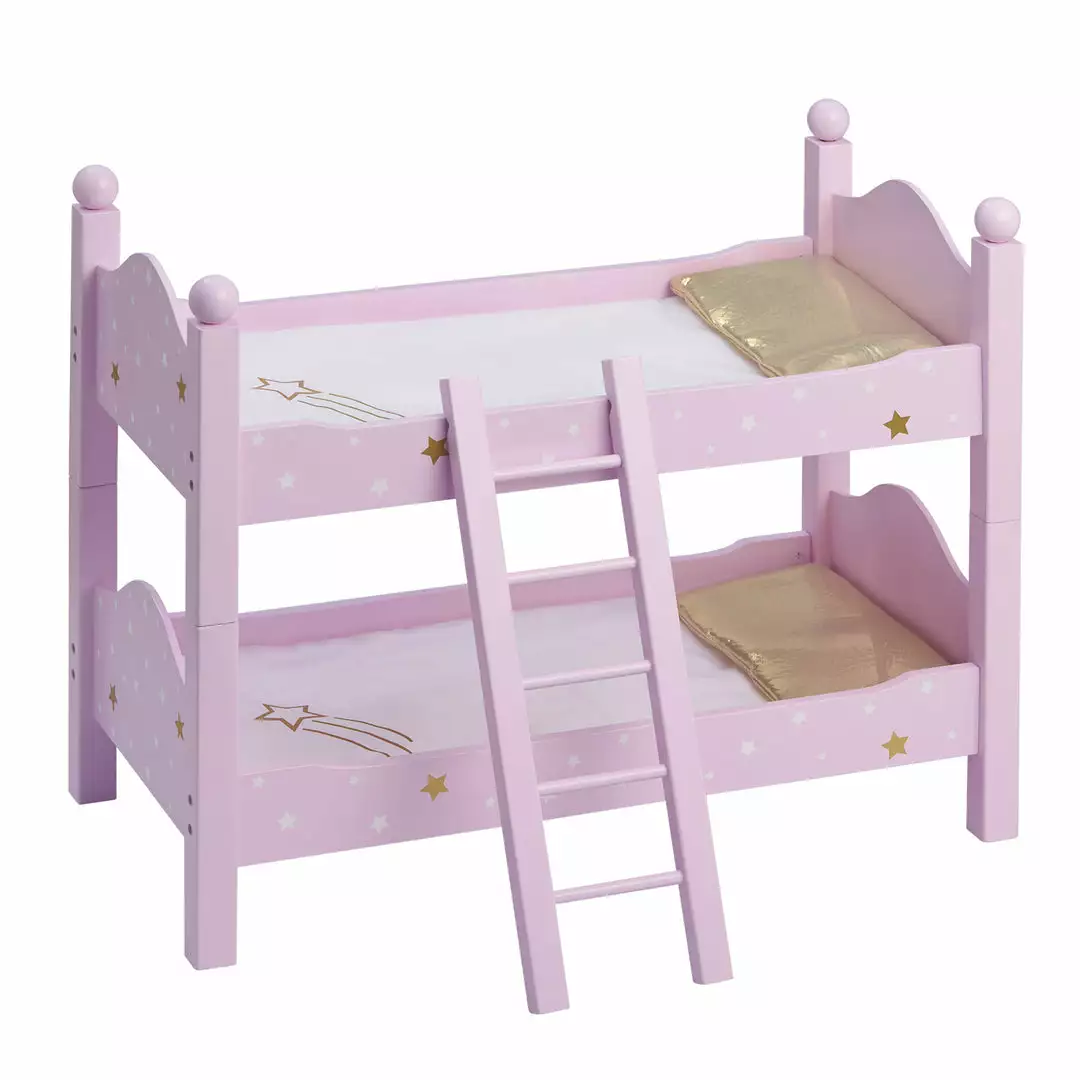 Bring your child’s doll collection a better night’s sleep with the Olivia’s Little World Twinkle Stars Princess Double Bunk Bed for 18″ Dolls. Whether your little one has multiple dolls or they’re having a sleepover with friends, this bunk bed provides a cozy resting place for their dolls when the lights go out. This multicolor toy bunk bed features a pink design decorated with gold and white stars for a bedroom or play area addition that’s fit for a princess. Equipped with headboards and footboards for each bunk, a ladder connecting the bunks, white blankets with a shooting star design, and gold pillows, this toy bed has everything necessary to keep your child’s dolls warm and comfortable through the night. Constructed of eco-friendly MDF, this sturdy doll bed is designed for long-lasting use and is easy to wipe clean for every day messes. Included with the toy bunk bed are step-by-step instructions for quick and easy assembly. This bunk bed is designed for use with dolls up to 18″ tall. The Olivia’s Little World Twinkle Stars Princess Double Bunk Bed measures 20″ x 10.63″ x 17.13″ and is recommended for children ages 3 years and up.