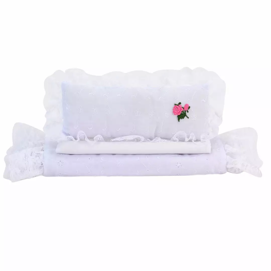 This traditional white eyelet bedding set is sure to give your little one’s doll sweet dreams. The 3 piece set includes a white pillow, mattress pad, and embroidered eyelet comforter with beautiful detailing including an embroidered white rose appliqué and lace trim. The gorgeous set is the perfect decorative accessory to elevate any 15 or 18 inch doll bed or crib. The dreamy doll furniture set will inspire magical moments of creative play for your little one. Bed and frame not included.
