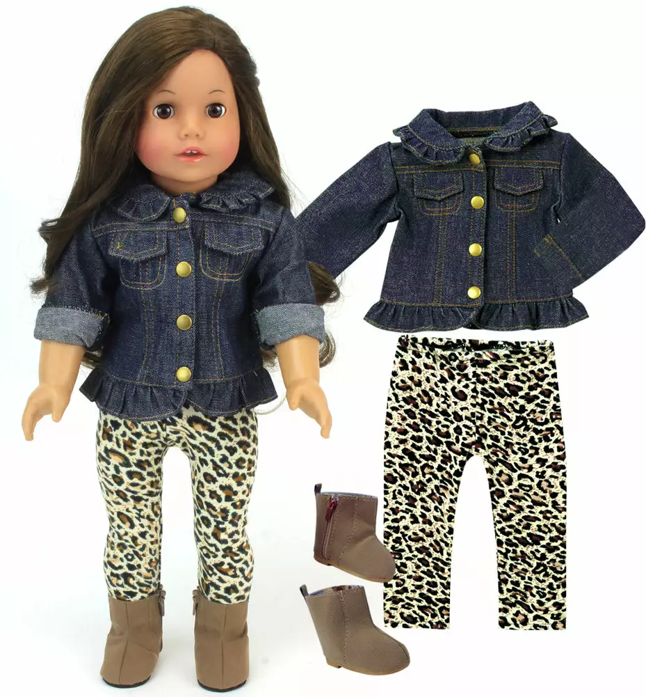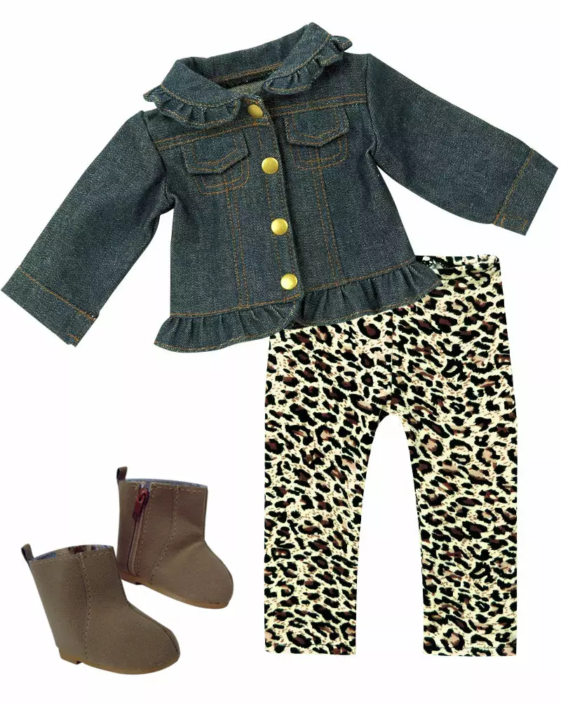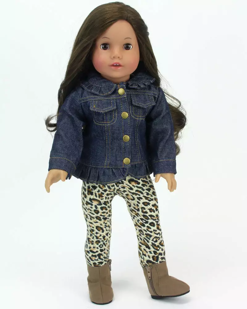 - DOLL CASUAL OUTFIT SET: Includes a ruffle denim jacket with brass buttons, animal print stretch leggings, and brown suede ankle boots with zipper for a colorful, stylish outfit