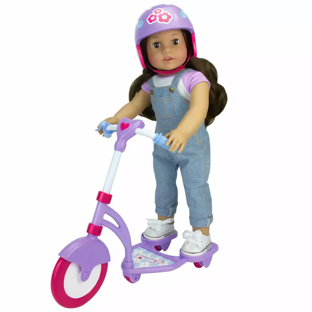 Feed your little one’s interest in sports and athletics with this charming scooter and helmet pairing from Sophia’s by Teamson Kids. Set features a matching fitted helmet with fast-rolling scooter for an exciting (and safe!) day of wheeling around town. Made for 18″ Dolls, the set is compatible with Sophia’s by Teamson Kids Dolls, American Girl dolls, My Life As dolls, Our Generation dolls, and more! Dolls not included.