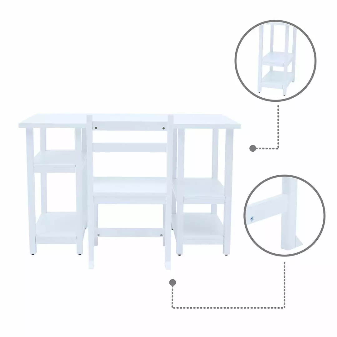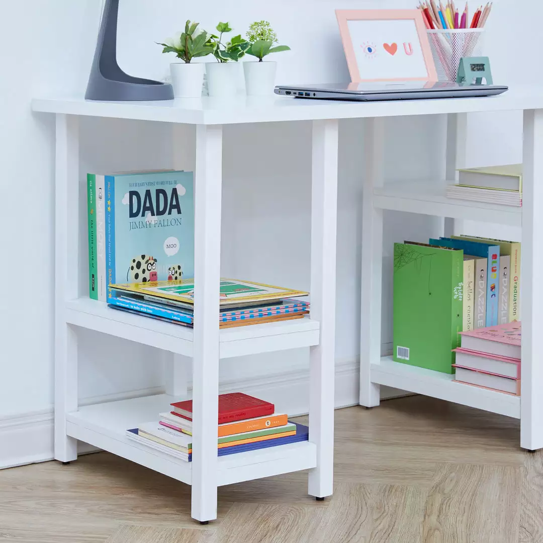- EXTRA STORAGE: Two shelving sides underneath the table top are perfect for use as bookshelves, storage for notepads, craft or school supplies, and more!