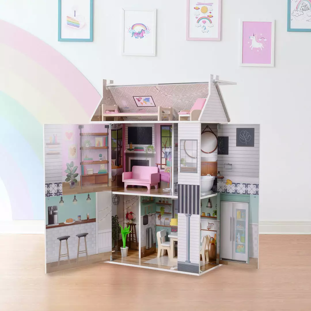 Give your little one’s doll collection a stylish place to stay with the Olivia’s Little World by Teamson Kids Dreamland Farmhouse Dollhouse. This modern farmhouse-style dollhouse features a multicolor design, making it great for both boys and girls, and it completes any home, classroom, preschool, or daycare playroom. The multi-sided design features three openable doors and a roof panel to access various parts of the house, while the kitchen, living area, bedroom suite, bathroom, and rooftop deck provide your little one’s dolls with everything they need for their dream home. This complete dollhouse playset with accessories includes a bed with attached pillow, a sofa, a dining table with two chairs, two reusable sticker sheets, a plant, a lounge chair, a floor lamp, a pendant light, a bathtub, and a toilet with sound effect (requires three included LR44 batteries) for hours of interactive fun. The durable MDF construction is kid-safe and easy to wipe clean for every day messes. The easy-to-follow instructions allow for quick adult assembly so play time can start right away. This dollhouse measures 25″ x 13″ x 35.5″ and is compatible with 12″ dolls. Recommended for children ages 3 years and up. Five LR44 batteries included.