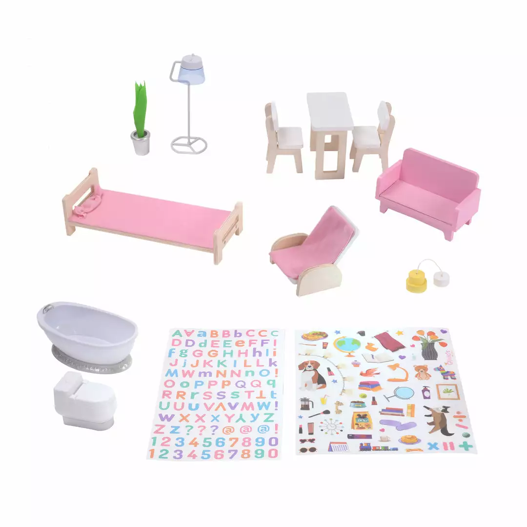 • 13 ACCESSORIES INCLUDED: Includes a bed, sofa, dining table and two chairs, two reusable sticker sheets, plant, lounge chair, floor lamp, pendant light, bathtub, and toilet with sound effect (requires three included LR44 batteries)