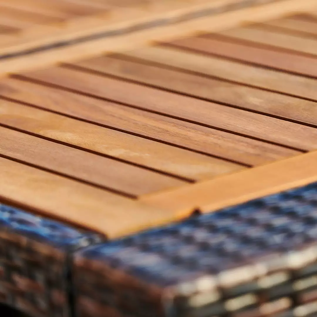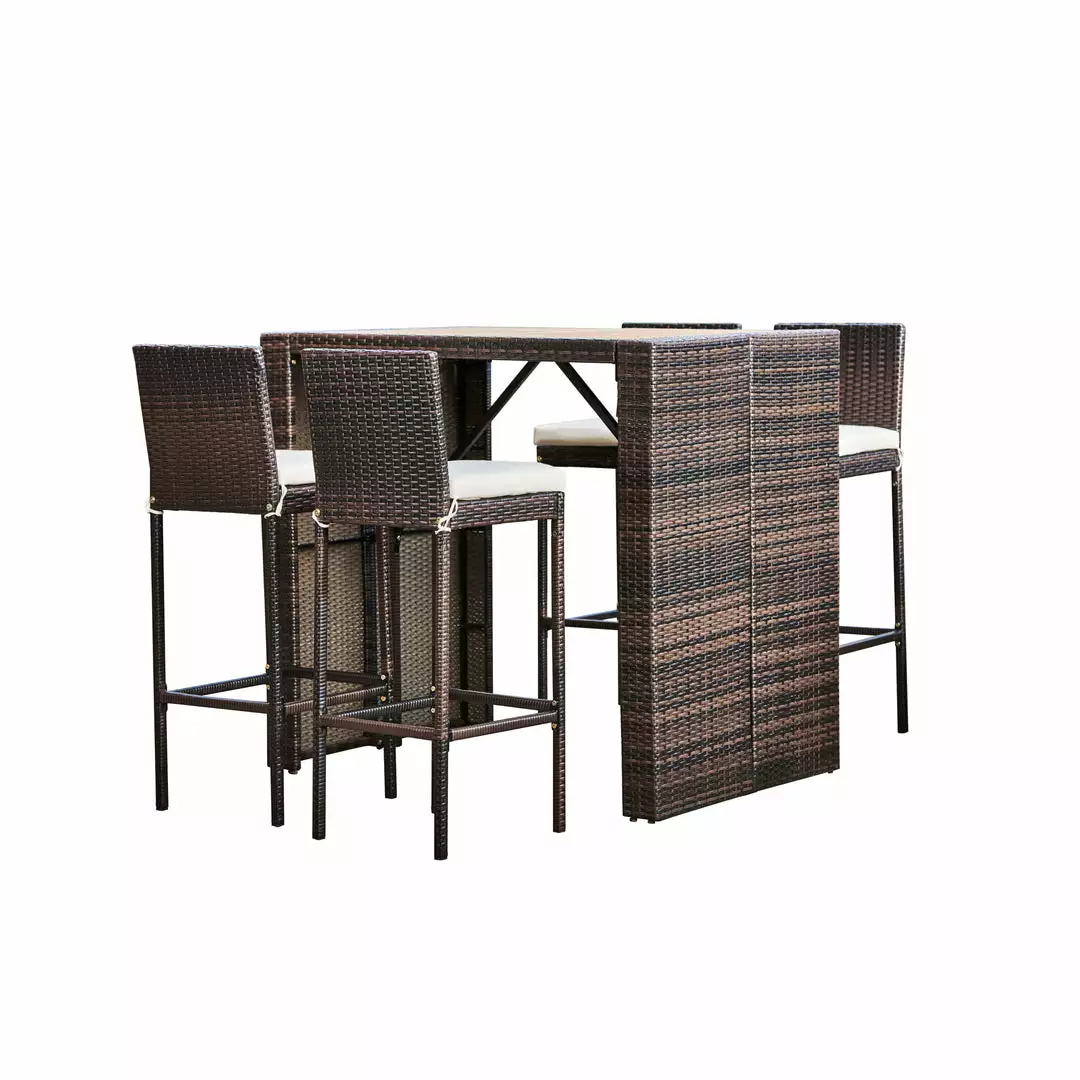 - STYLISH: Dine in style with this rattan and Acacia wood bar set. The quality materials allow four guests to comfortably gather outside for drinks and appetizers.