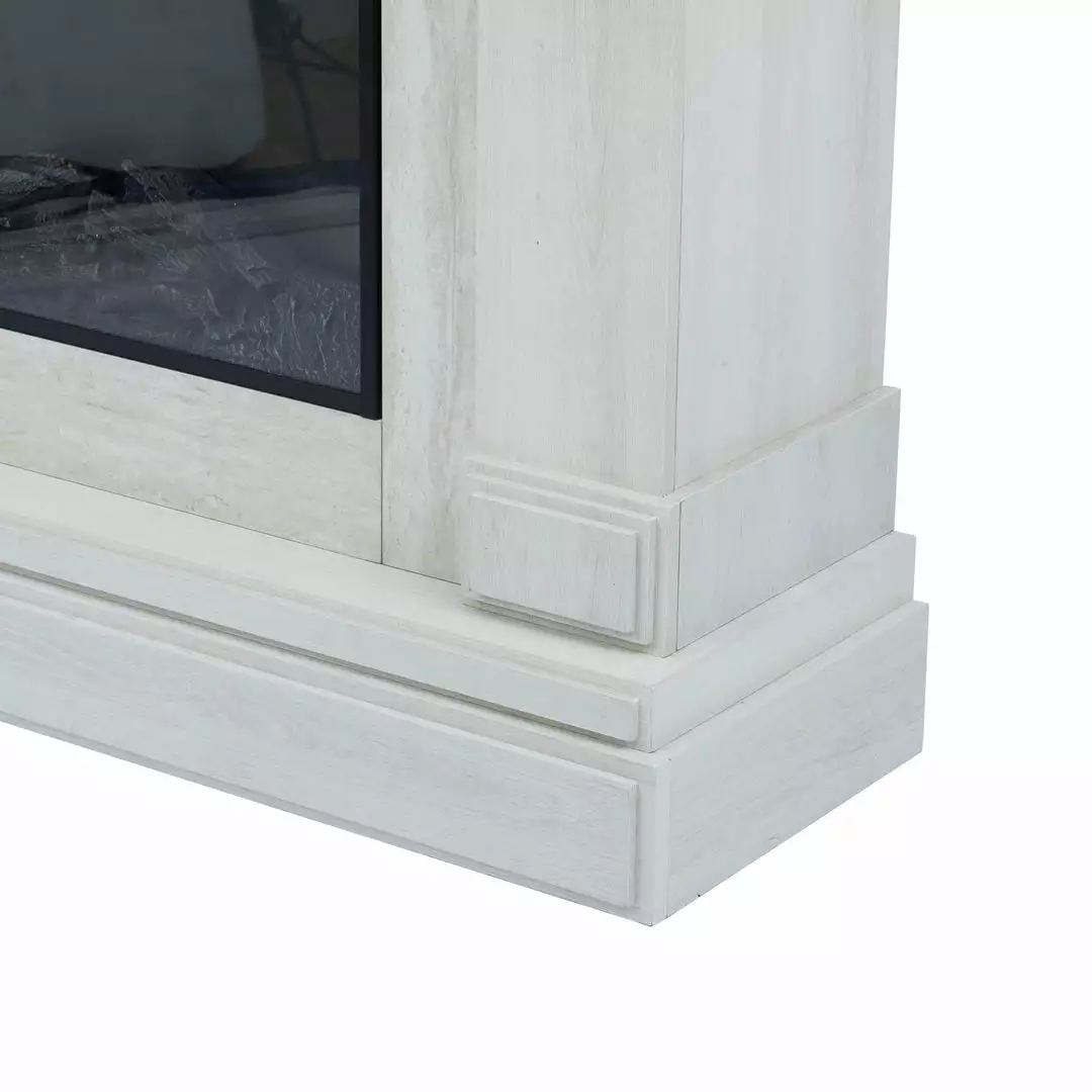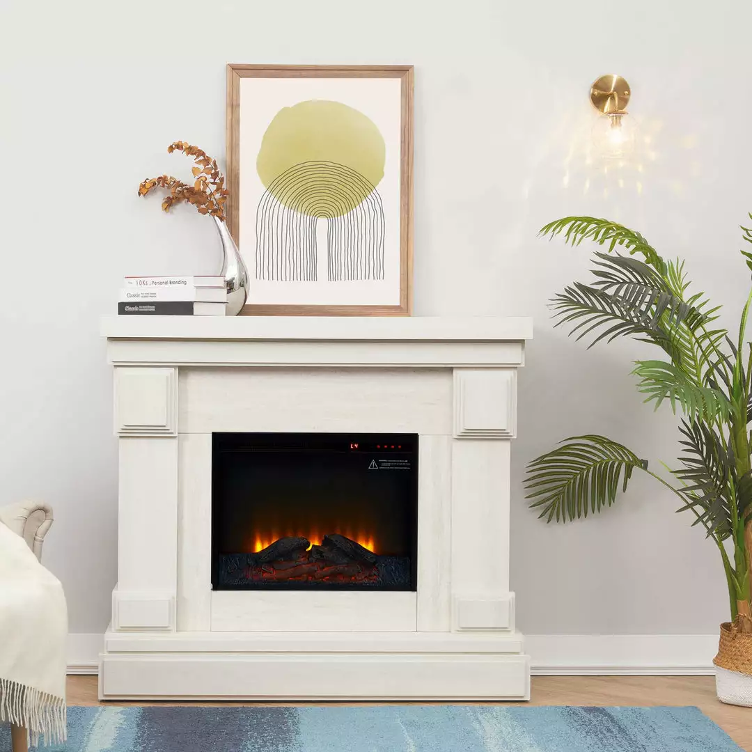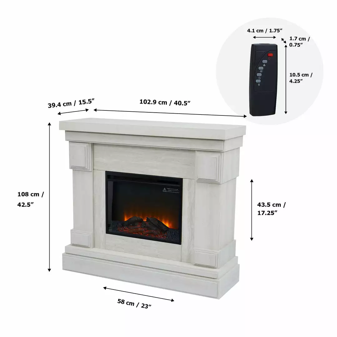 This Teamson Home electric fireplace blends modern elegance with innovative electric heating technology, making it a perfect source of supplemental heat for any room in your home. Featuring a white mantel, light gray faux marble surround, remote control, and realistic flame effect with optional heat, this fireplace is the perfect accent to any living space. The light gray faux marble finish adds a sophisticated modern look to the fireplace. This mantel measures 47.5″ long, 15.5″ deep, and 42.5″ tall and includes a 23″ flame insert and offers a place for family photos or holiday decorations, while the simulation flame effect and heat bring a sense of warmth into your home all year round. The included remote control allows you to turn the fireplace on/off, adjust the temperature and flame, and even set a timer! When you don’t need the heat, just turn on the flame effect to add warm ambience and a stylish feature to your living space. This mantel is made of high quality MDF with a sturdy base to ensure stability and durability for long-lasting use.