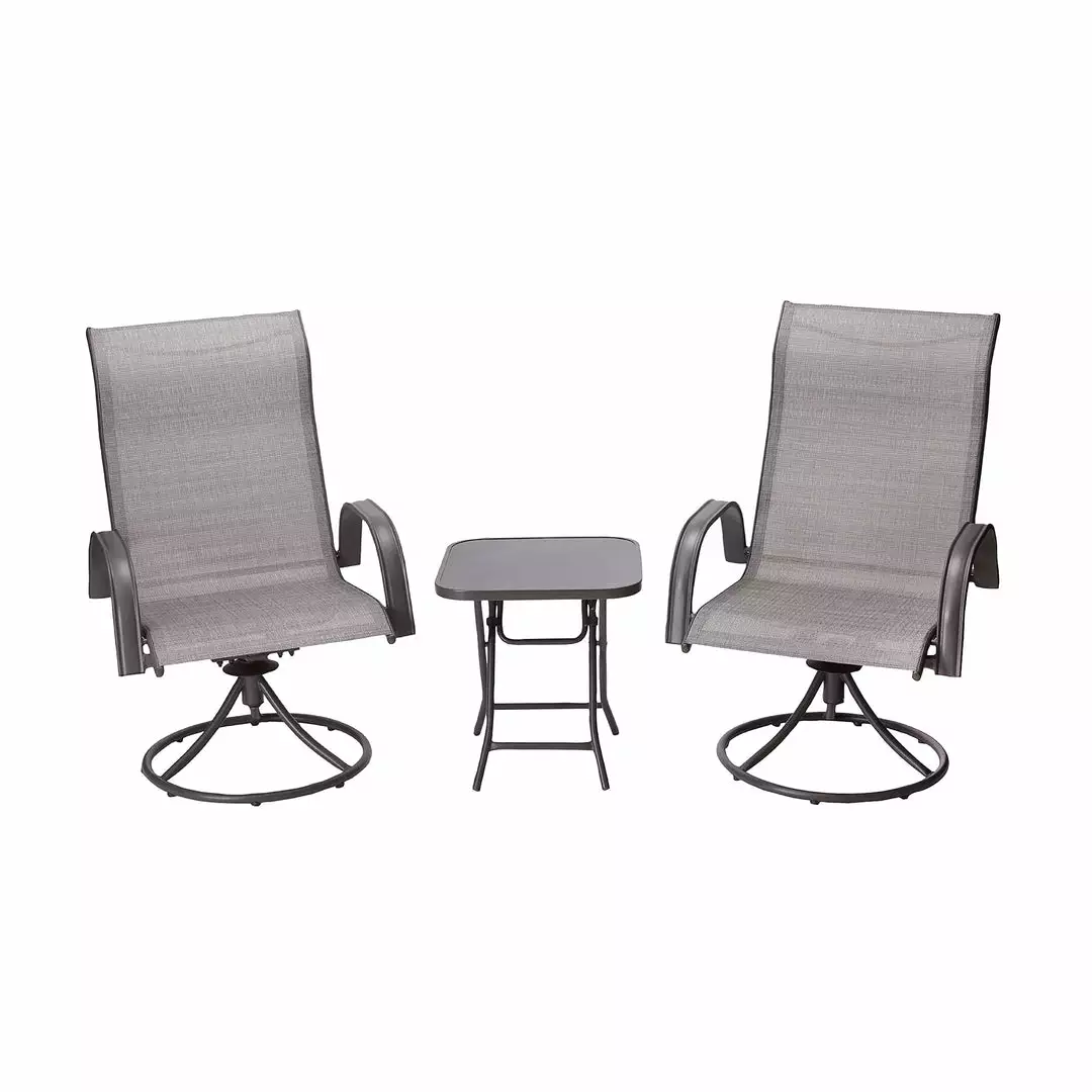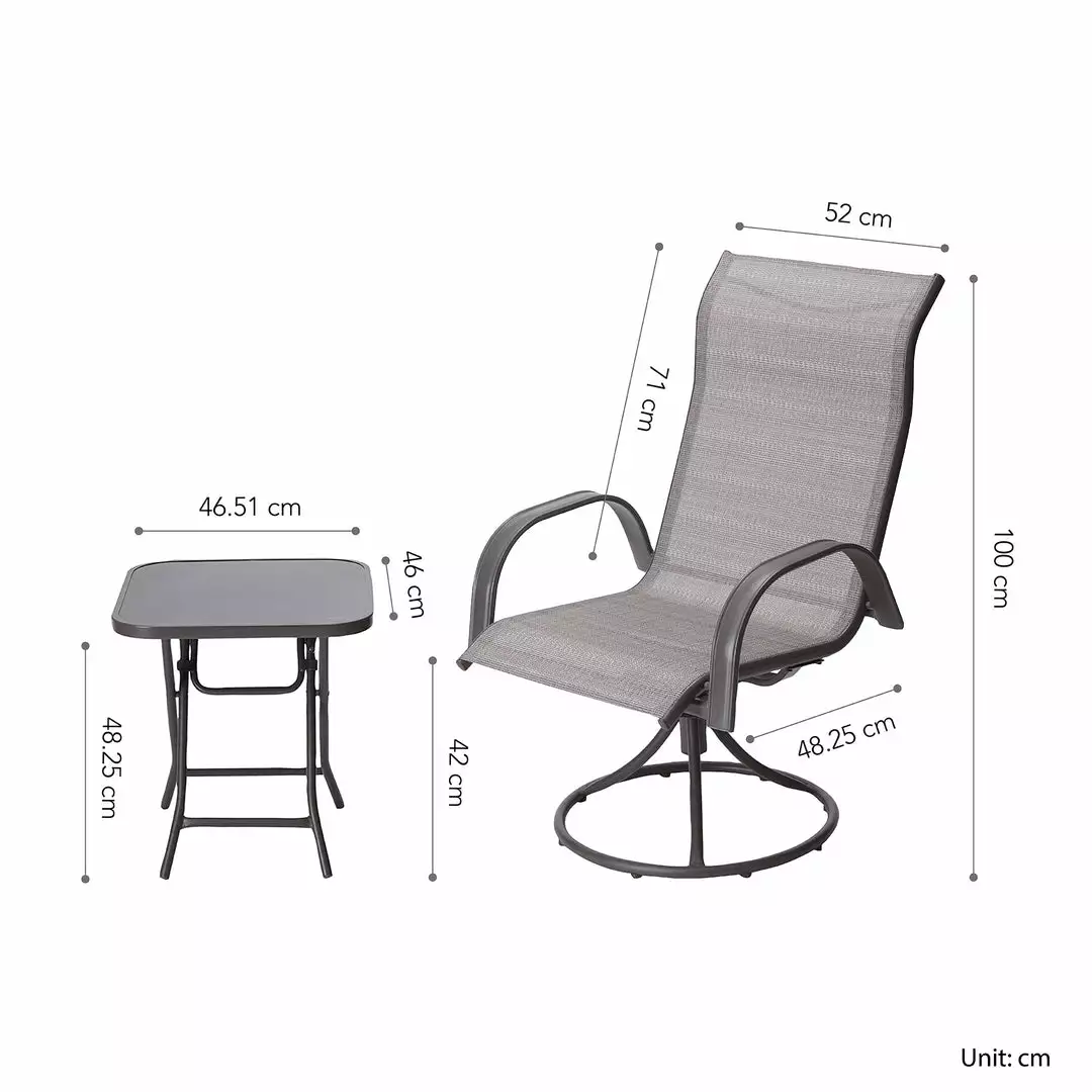 Enjoy friendly conversation and a cup of coffee in your outdoor space with the Teamson Home Indoor/Outdoor Steel Swivel 3 Piece Bistro Table and Chairs Set. This classic patio table and chairs set will add a unique and eclectic addition to your garden, courtyard, or indoor living area. The 3-piece set includes a table and 2 chairs and is perfect for entertaining in your home’s outdoor area. With a durable textilene fabric and a sturdy steel construction, this bistro set is built to last. For added versatility, the table folds down to easily store when not in use. This long-lasting patio set is reliable, and provides sturdy and stable seating for 2 people. The chairs also feature a swivel action for versatile and comfortable use on your patio or porch. For easy transportation, this bistro set has lightweight pieces. This table and chairs set is easy to clean for hassle-free maintenance. Step-by-step instructions are included for easy assembly. The bistro table measures 18″ long, 18″ wide, and 19″ tall and the chairs measure 31″ long, 26″ wide, and 4 ” tall.