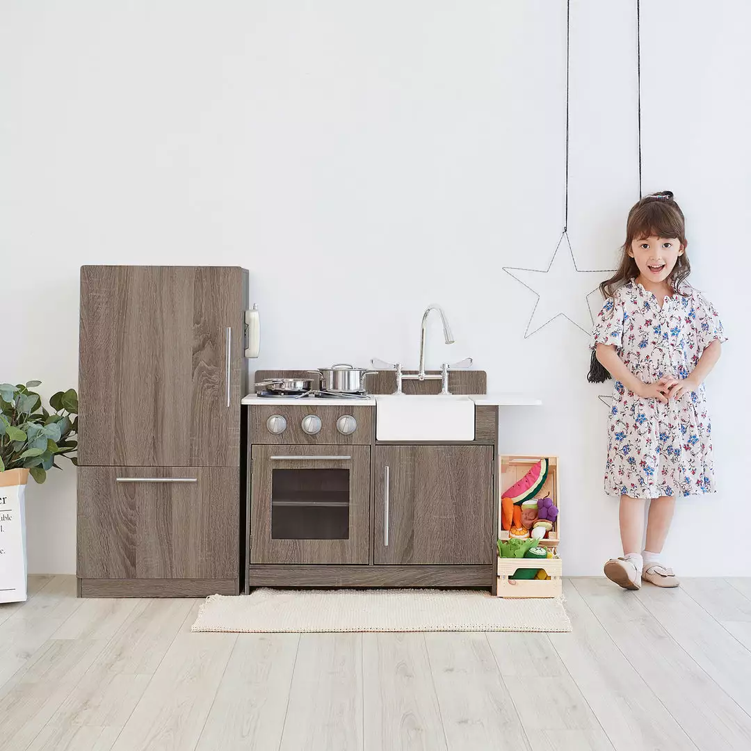 Help your little one create gourmet meals of their own with the Teamson Kids Little Chef Chelsea Modern Kids Kitchen Playset. This contemporary play kitchen is designed with a cherry grain natural wood finish and silver hardware, making it great for both boys and girls, while it completes any home, classroom, or playroom. The interactive design of this play kitchen includes opening oven and refrigerator doors, 3 turning knobs, 2 oven burners, a freezer, a sink, and an under-sink cabinet to make playtime more realistic. The eco-friendly MDF construction of this pretend play set is kid-safe and easy to clean for easy upkeep. Included step-by-step instructions allow for quick adult assembly so play time can start right away. This kid-sized toy kitchen measures 41.75″ long 12″ deep, and 32″ tall and is recommended for children ages 3 years and up. Teamson is a global lifestyle home designs brand bringing joy into every home through beautiful, quality pieces made for stylishly comfortable everyday living. Our Teamson Kids brands give flight to fun, discovery and learning through beautifully crafted, safe, and trend-right furniture pieces and toys for kids with a spirit of curiosity and adventure.
