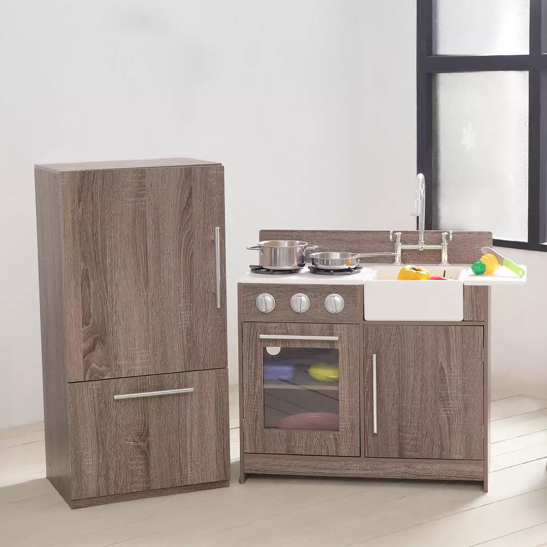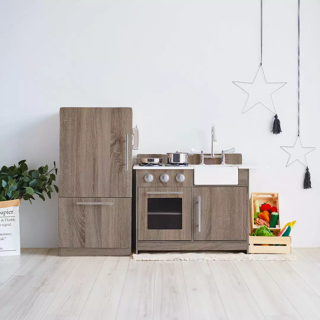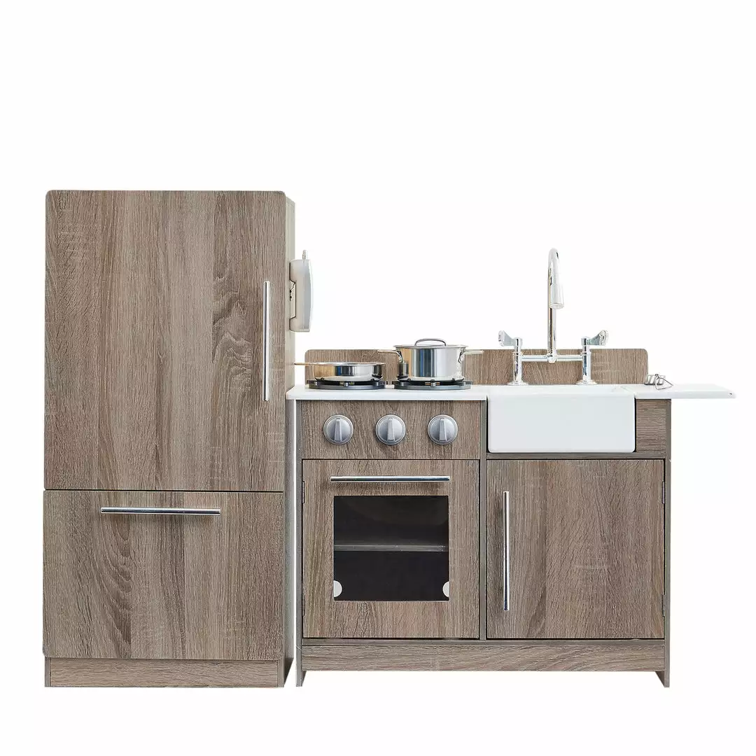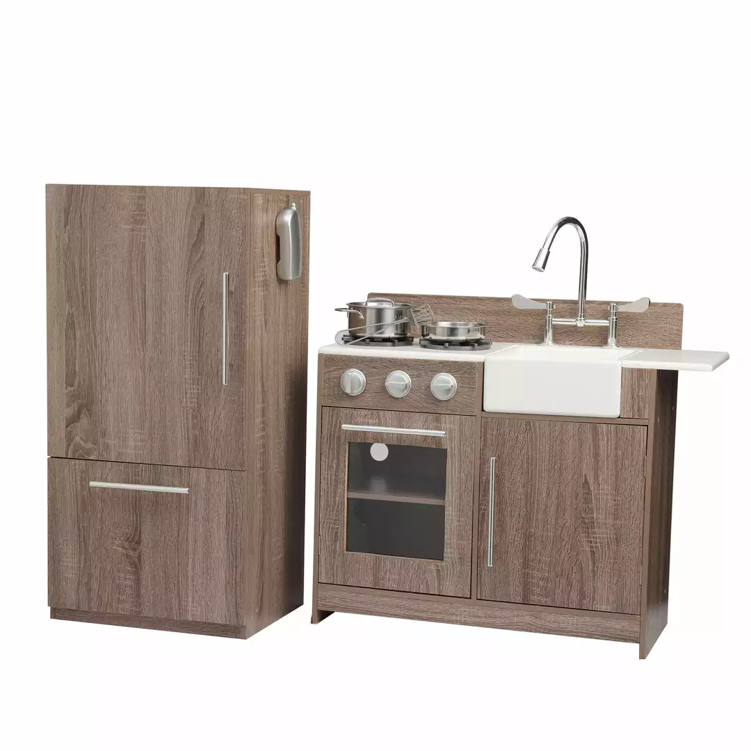 - INCLUDED: The set includes a freestanding refrigerator plus kitchenette with oven, stove and sink. Accessories include a pots, pan with lid, spatula and pretend phone for added play value.
