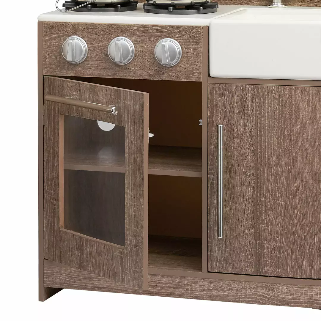 - FEATURES: Three turning and clicking knobs, raised burners, openable doors, farmhouse style sink, faucet with turning levers and an extended side counter make this detailed set even more realistic.