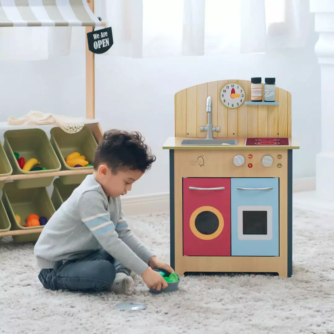 Give your little one their own cooking space with the Teamson Kids Little Chef Porto Kids Kitchen Playset. This classic-style play kitchen features a natural finish with bright red and light blue accents, making it great for both boys and girls, and it completes any home, classroom, preschool, or daycare playroom. The functional and interactive design features two openable doors, two rotating and clicking oven knobs, two printed induction burners, a removable sink with faucet, a spice rack shelf, and a clock to enhance your little one’s play time. With 4 included accessories – a plastic pot with lid and salt and pepper shaker bottles – this toddler kitchen encourages role play and lights up your little chef’s imagination and creativity. The durable MDF construction is kid-safe and easy to wipe clean for every day messes. The easy-to-follow instructions allow for quick adult assembly so play time can start right away. This kid-sized kitchen measures 18.75″ x 12.25″ x 27″ and is recommended for children ages 3 years and up.