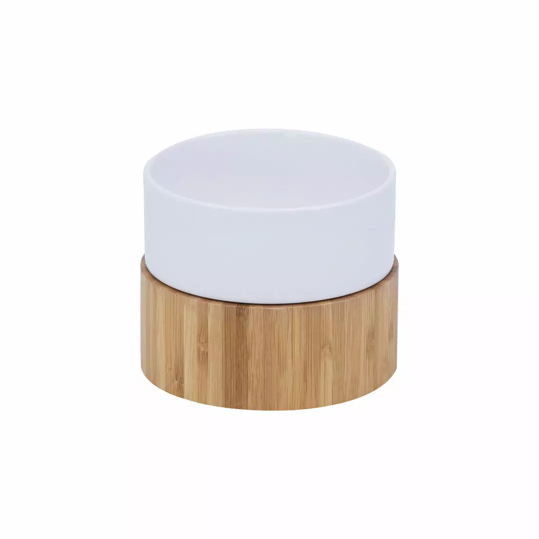 - INCLUDED: One bamboo wood platform feeder with a white ceramic food dish for cats or small dogs.