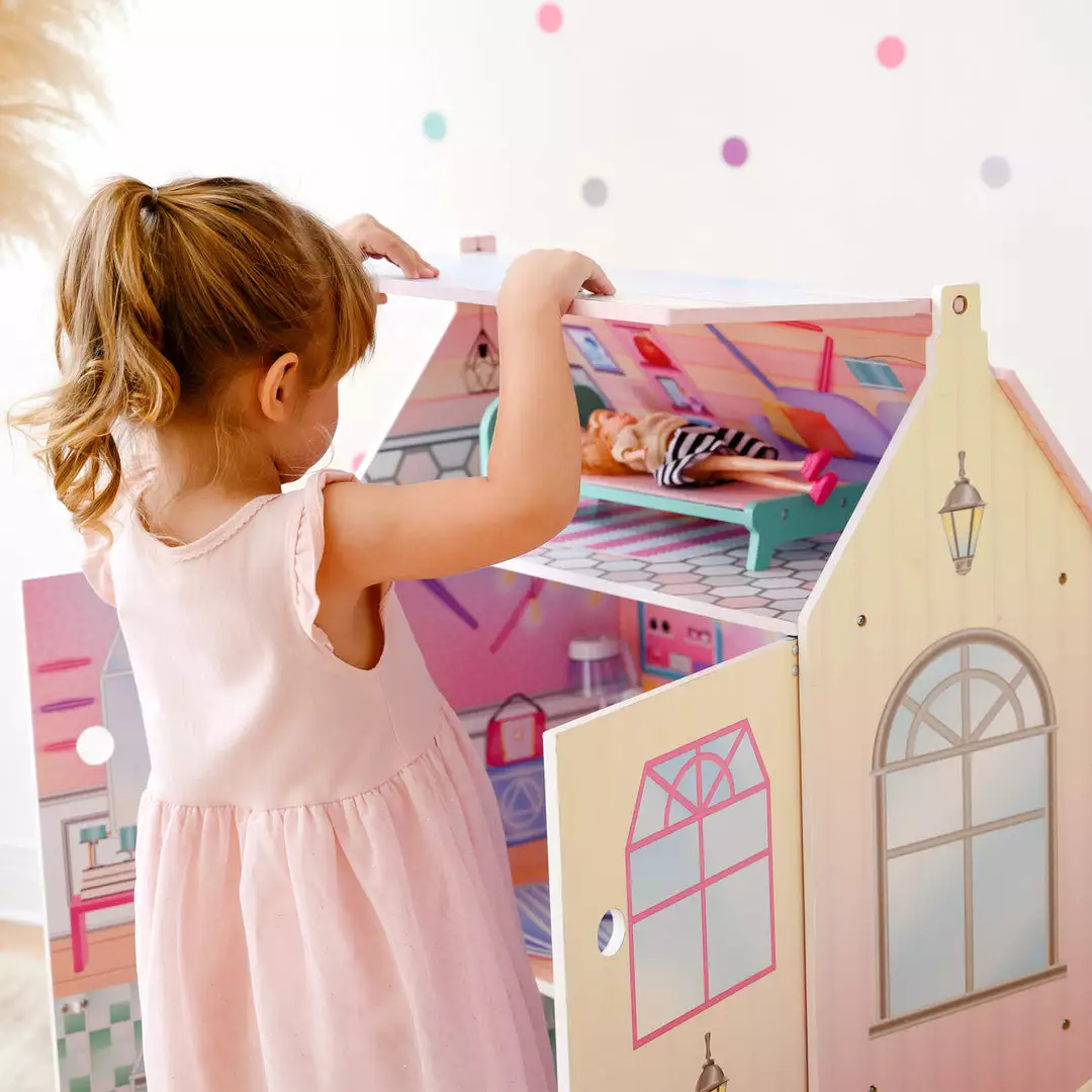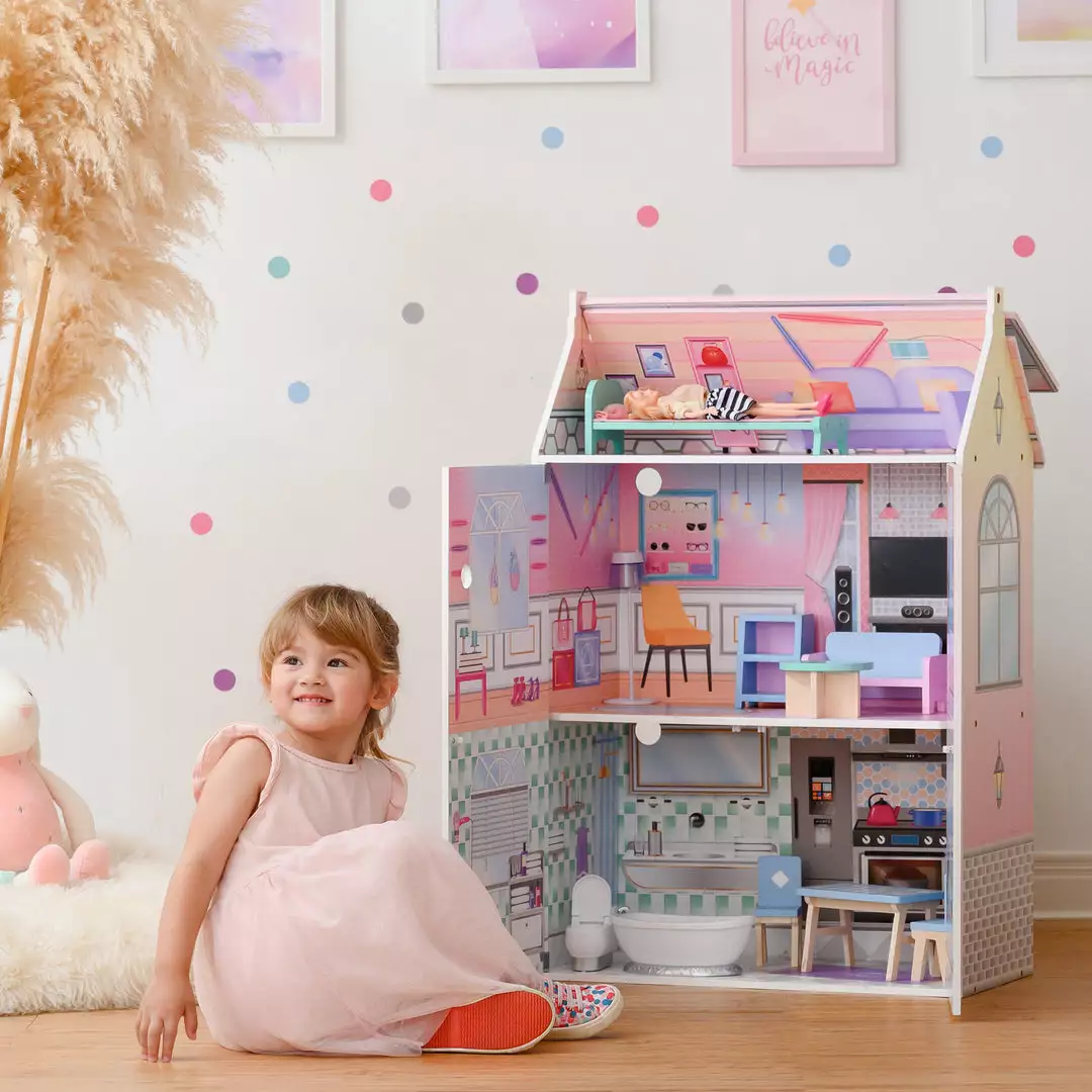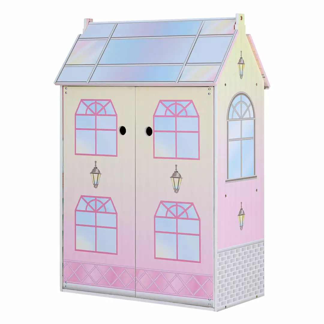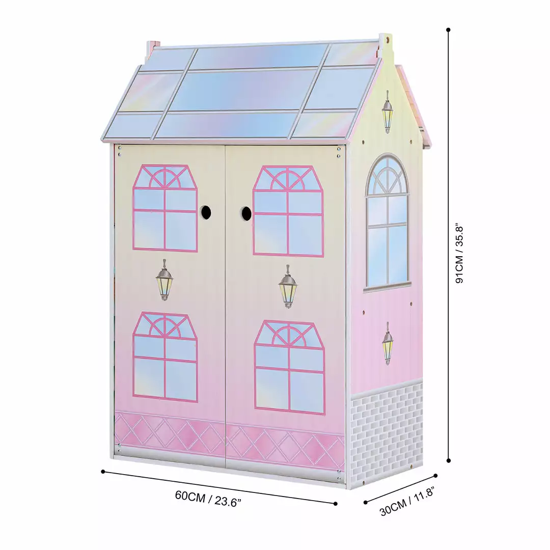 - KIDS DREAMLAND DOLLHOUSE: Features a 3-level design with a multicolor exterior, a glass-look roof, and an opening front panel for a fun and colorful addition to any playroom