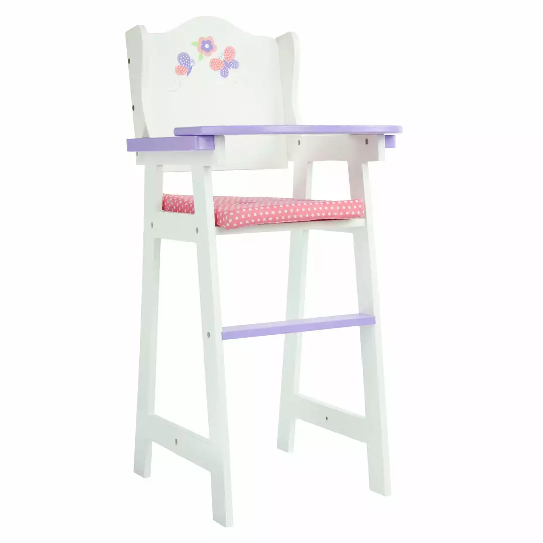 - BABY DOLL HIGH CHAIR: Features a classic white finish with flower embellishments and purple accents for a fun and functional addition to your child’s bedroom or play area