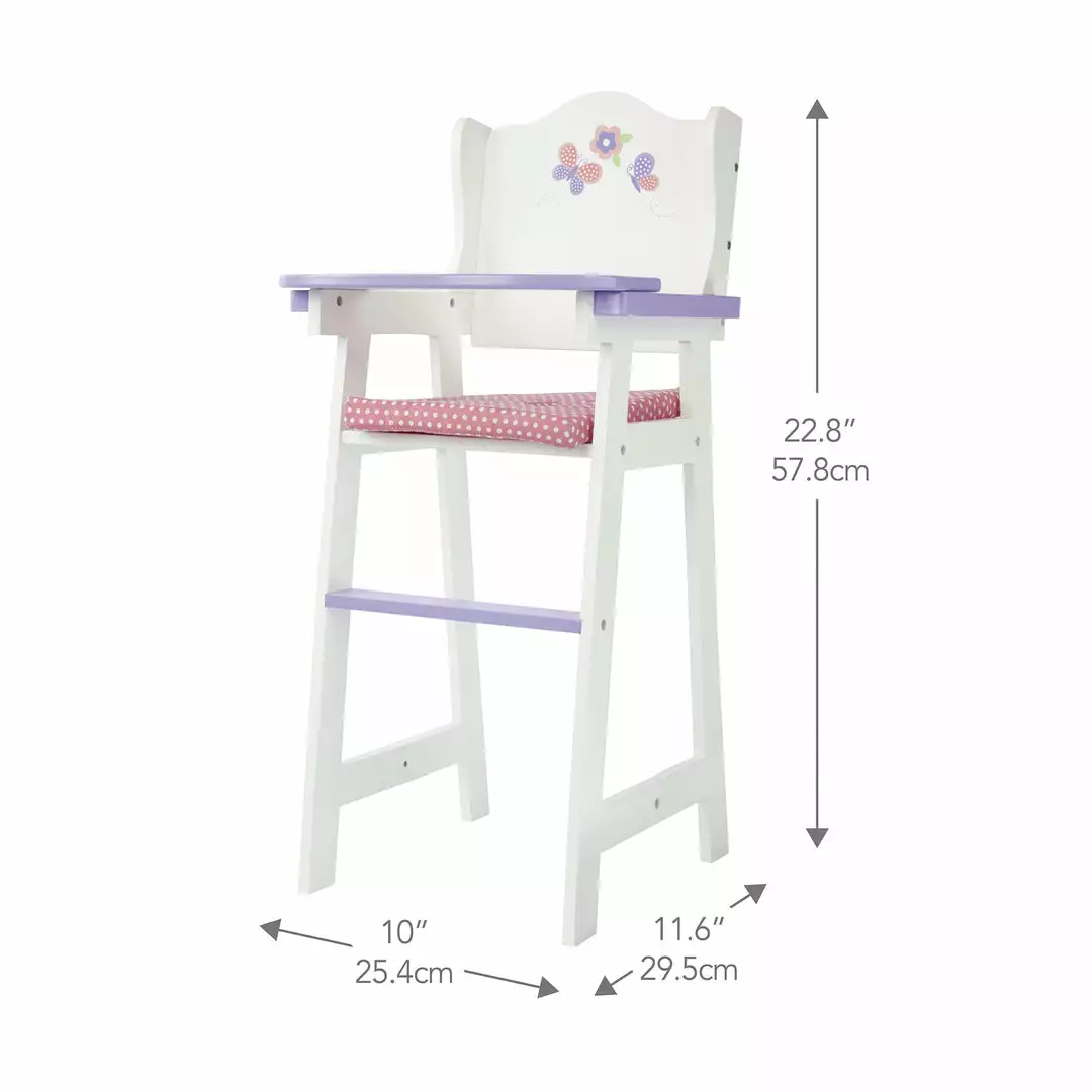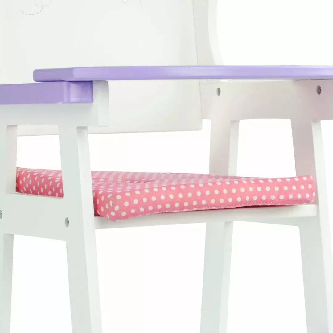 Make mealtime more magical for your little one’s dolls with the Olivia’s Little World Little Princess Kids Baby Doll High Chair. Featuring a classic white finish with flower embellishments and purple accents, this doll chair is a fun and functional addition to your child’s bedroom or play area. This high chair is includes a tray area for snacks, a foot rest, a high back, and a soft polka-dot pink seat cushion to keep your child’s dolls happy and comfortable during mealtimes. Constructed of eco-friendly MDF, this sturdy doll chair is designed for long-lasting use, and its easy-to-clean surfaces make wiping up every day messes a breeze. Purchase this doll high chair alone or with other items from the Little Princess collection for a bright and joyful playroom. Included with the toy high chair are step-by-step instructions for quick and easy assembly. This high chair is designed for use with 16″ to 18″ dolls. The Olivia’s Little World Little Princess Kids Baby Doll High Chair measures 11.63″ x 10″ x 22.75″ and is recommended for children ages 3 years and up.