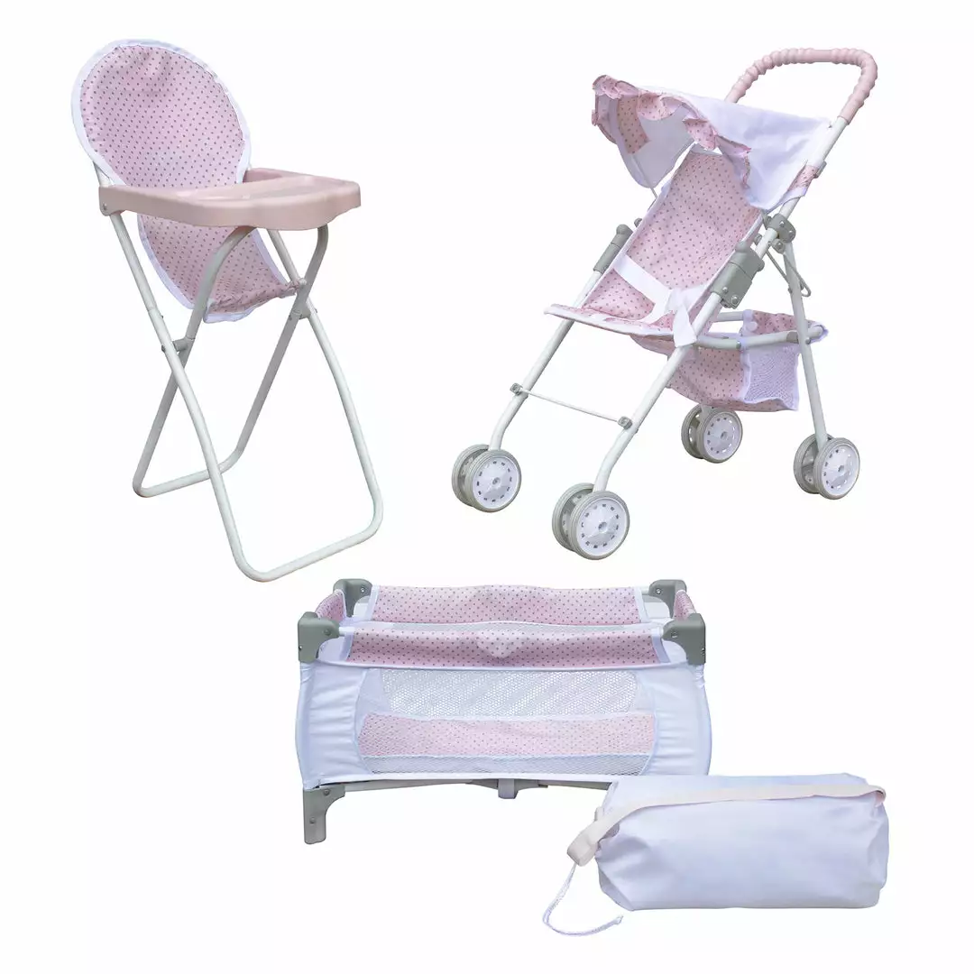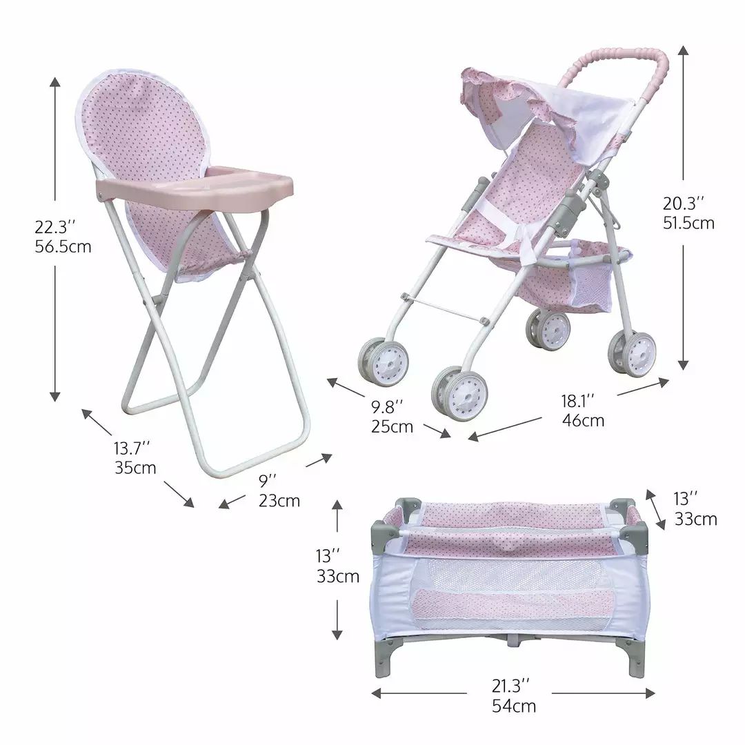 Keep your child’s dolls secure, comfortable, and entertained with the Olivia’s Little World Polka Dots Princess 3-in-1 Baby Doll Nursery Set. This colorful baby doll nursery kit features a stroller, a crib, and a high chair with pink fabric with gray polka-dot accents for a fun addition to your child’s bedroom or play area. This versatile kids playset will give your little one everything they need to care for their 16″-18″ baby dolls. Constructed from durable metal and polyester, this nursery set is built to provide long-lasting fun. Add this baby nursing station to your child’s toy collection alone or with other items from the Polka Dots Princess collection to make playtime more magical. High chair measures 9″ x 12.25″ x 22″, Stroller measures 10.25″ x 18.5″ x 20.5″, Pack ‘n play measures 22″ x 13″ x 13″. The Olivia’s Little World Polka Dots Princess 3-in-1 Baby Doll Nursery Set is recommended for children ages 3 years and older.