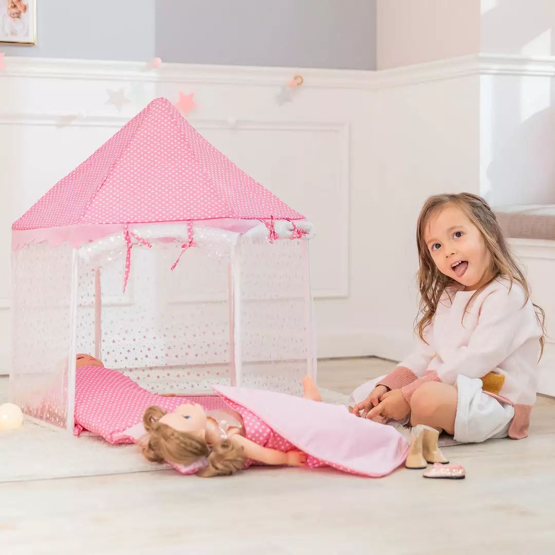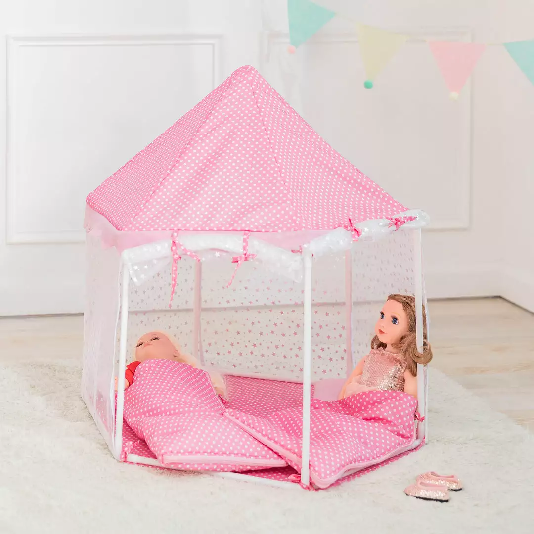 Bring your child’s doll collection a better night’s sleep with the Olivia’s Little World Olivia’s Kids Toy Doll Tent with Sleeping Bags for 18″ Dolls. Whether your little one has multiple dolls or they’re having a sleepover with friends, this tent provides a cozy resting place for their dolls to gaze at the stars. This stylish toy tent features an colorful white construction with shining stars on the see-through sides and a pink top with white polka dots for an elegant and fun addition to your child’s playroom or bedroom. This tent’s two-sided entrance makes playtime more convenient. The sides of this toy tent can be rolled up or let down and the 2 included sleeping bags can be removed for multiple configuration options. Travel bags are also included to allow your child to pack up their dolls’ sleeping bags and take them to sleepovers for fun with friends. Step-by-step instructions allow you to assemble this tent quickly and easily. This tent is designed for use with dolls up to 18″ tall. The Olivia’s Little World Olivia’s Kids Toy Doll Tent with Sleeping Bags for 18″ Dolls measures 27.5″ x 27.5″ x 27.5″ and is recommended for children ages 3 years and up.