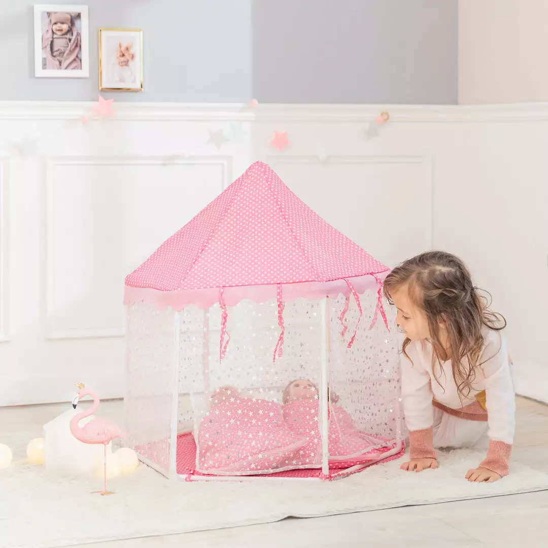 - FABULOUS DESIGN- Stars shining on the side makes the night bright and clear. Polka Dots on the top add more delicate to the piece. The see-through fabric also let your kids have a sneak peek on their dolls.