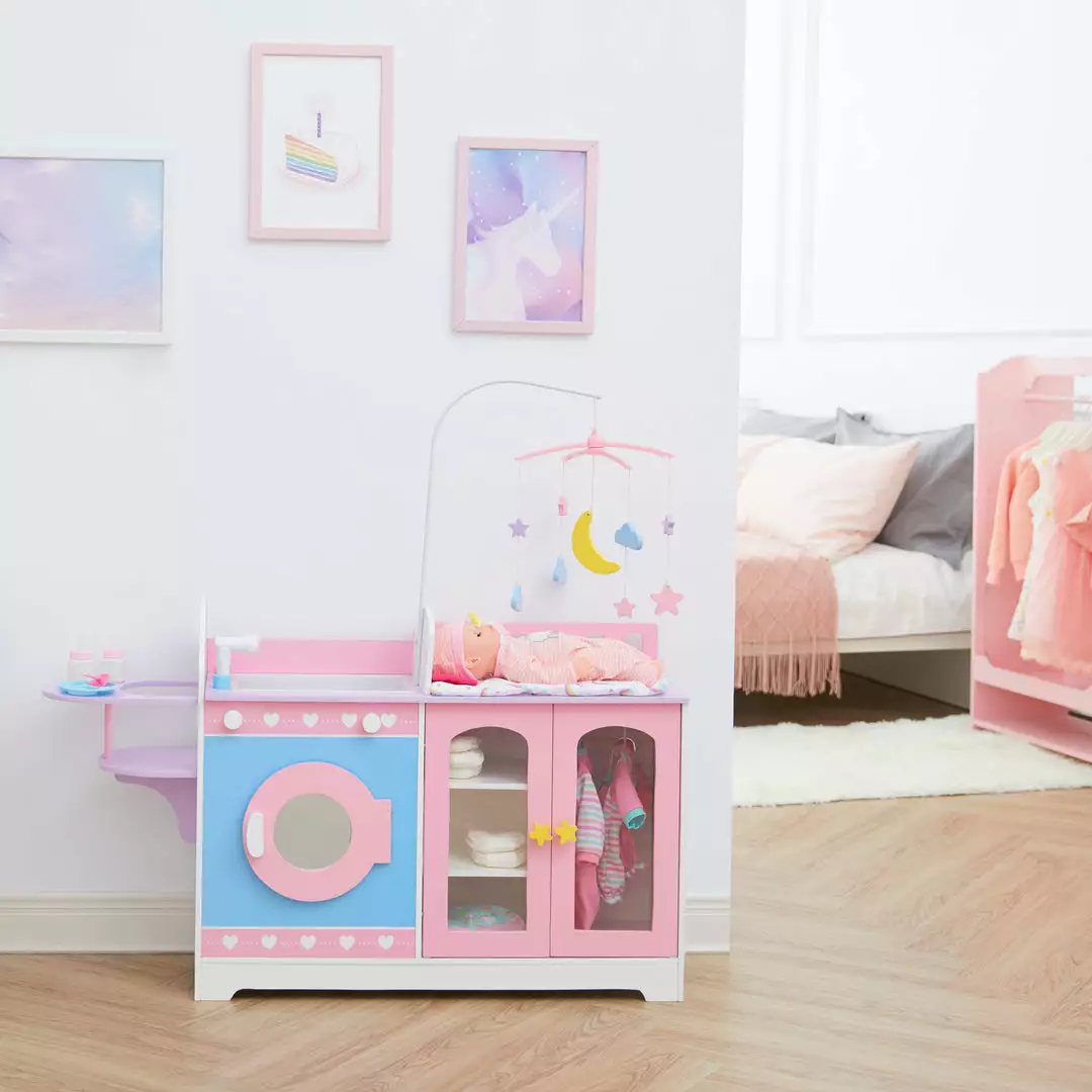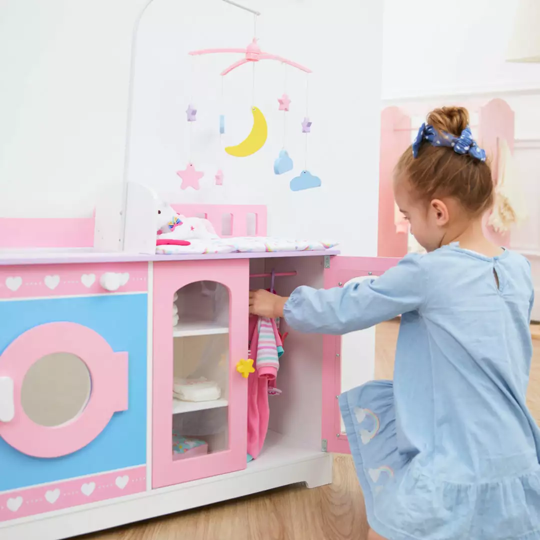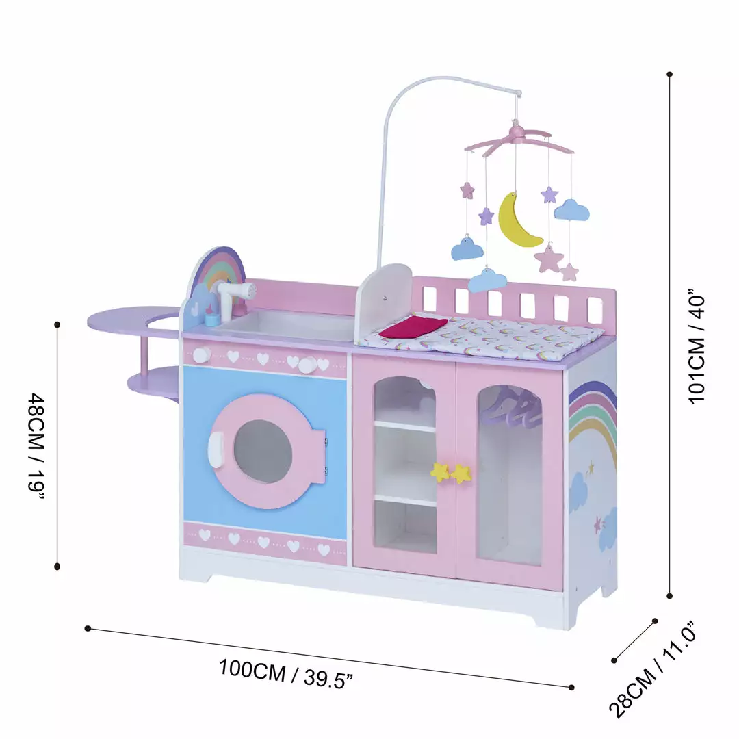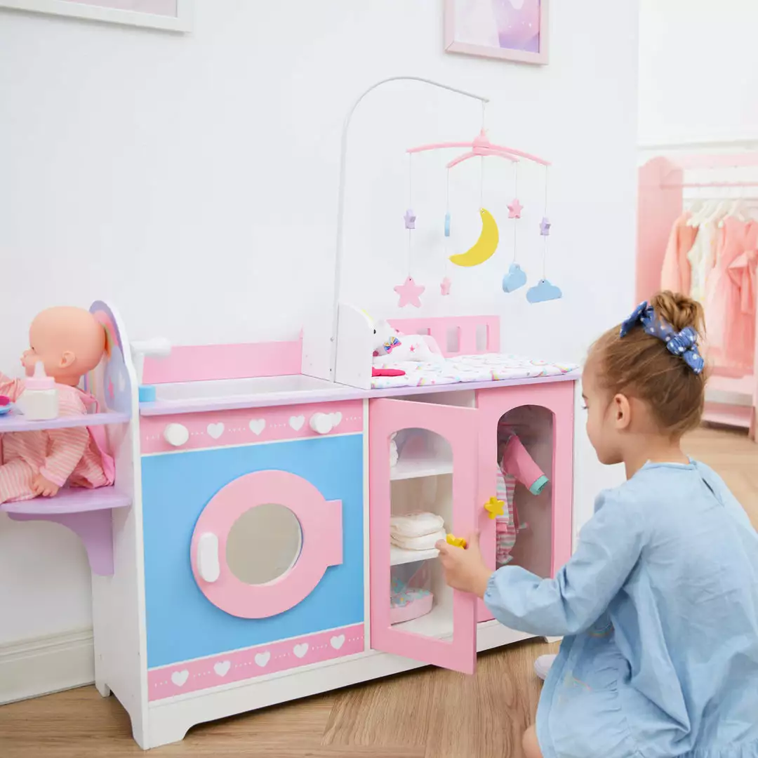 - 6-IN-1 DESIGN: Features a changing area with bedding and mobile, a sink for bath time, a high chair for mealtime, and a washing machine to enhance your little one’s playtime