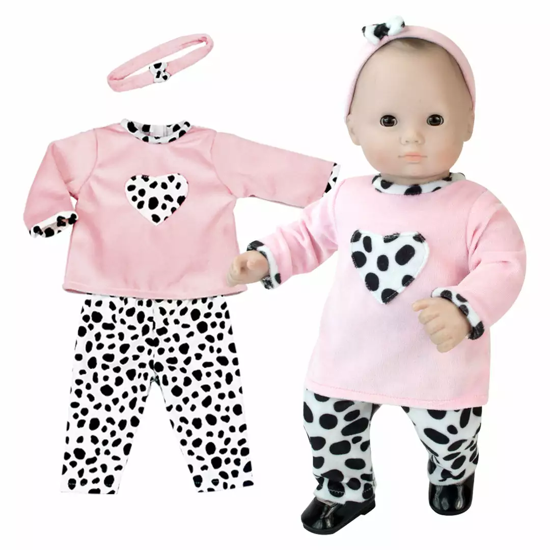 - INCLUDED: Pink long sleeve shirt, black and white dalmatian print pants and pink headband with dalmatian print bow, sized for 15 inch dolls.