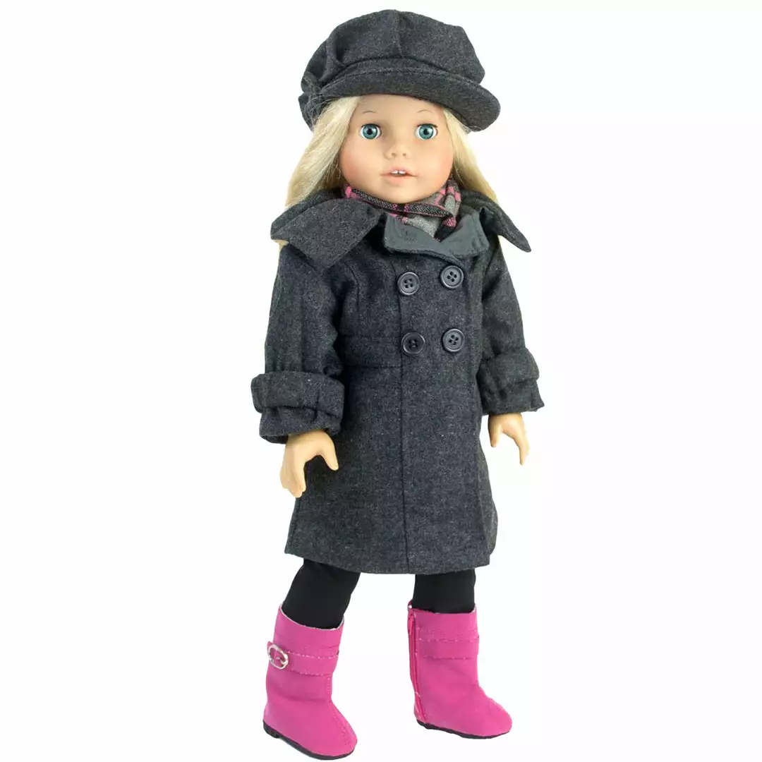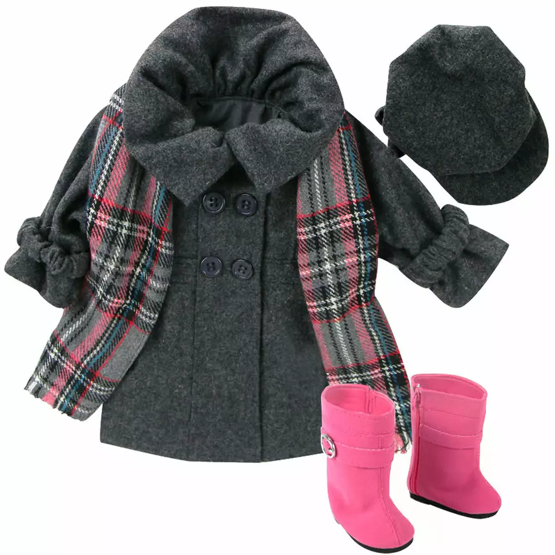 - INCLUDED: This ultimate winter wear, 4-piece set includes a gray dress coat, matching hat, plaid scarf and pink boots.