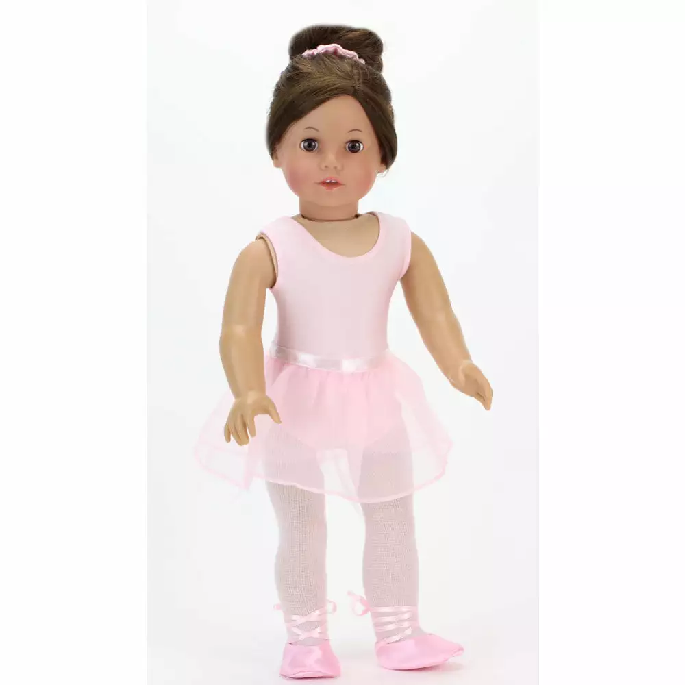 From pirouettes to demi-pliés, bring a little ballet fun into your child’s playtime with the Sophia by Teamson Kids complete 5-Piece ballet outfit for 18” dolls. Featuring a beautiful light pink sleeveless leotard, gathered hair accessory, organza skirt, pink tights and satin lace up ballet slippers, your child is all set to make their favorite doll into a pretty ballerina. Doll not included.