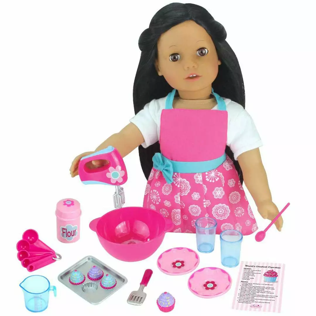 - INCLUDES: 18 piece set includes everything need for baking: apron, recipe card, mixer, mixing bowl, mixing spoon, measuring cup, measuring spoons, flour canister, spatula, 2 plates, 2 cups, baking tray and 4 cupcakes for hours of fun!