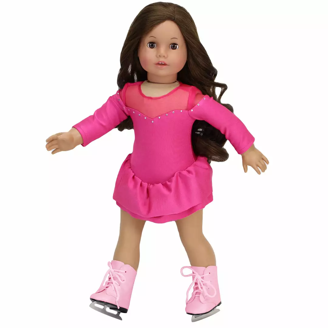 - INCLUDED: One pair of light pink faux leather ice skates with white shoe laces and metal “blades” sized for 18 inch dolls.