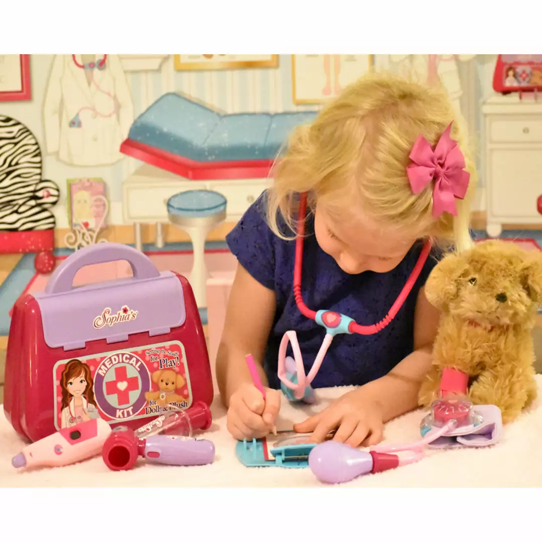 Inspire your little one’s interest in science with Sophia’s by Teamson Kids Medical Kit. This 10 piece kit includes everything a practicing doctor needs, including a stethoscope, blood pressure cuff, otoscope, syringe, thermometer, bandage, clipboard, pencil and chart. These medical tools will inspire hours of pretend play, and possibly help with real-world doctor’s visit jitters as your little one creates a kind and caring doctor healing others. A perfect educational gift or learning tool for ages 3+. Made for play with 18″ dolls, the set is compatible with Sophia’s by Teamson Kids Dolls, American Girl dolls, My Life As dolls, Our Generation dolls, some plush animals, and more! Dolls not included.