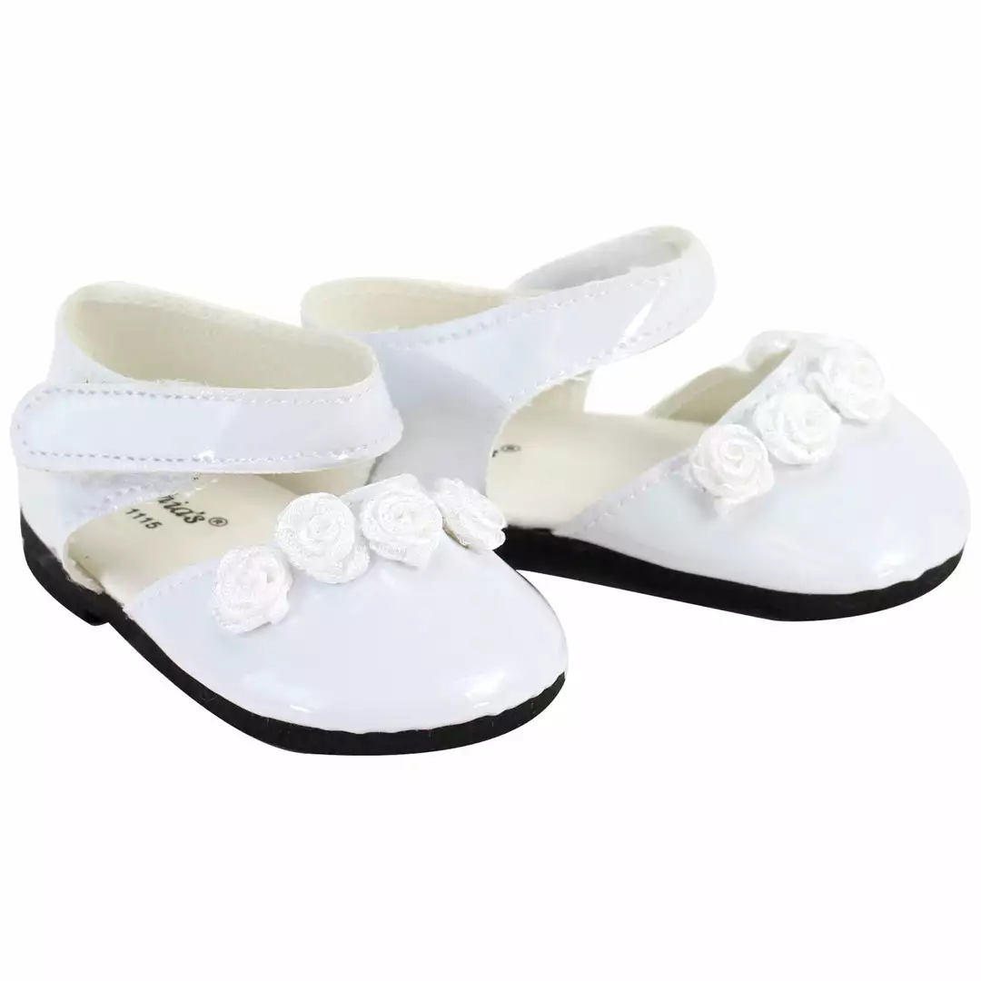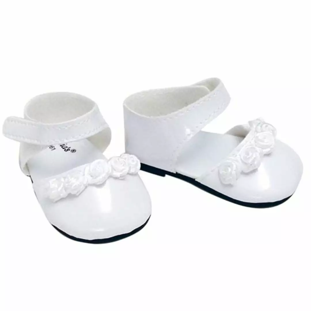 - INCLUDES: 1 Pair of white patent leather shoes, featuring satin rose ribbon trim, hook and loop closure on straps for easy removal, for a classy finish to any outfit!