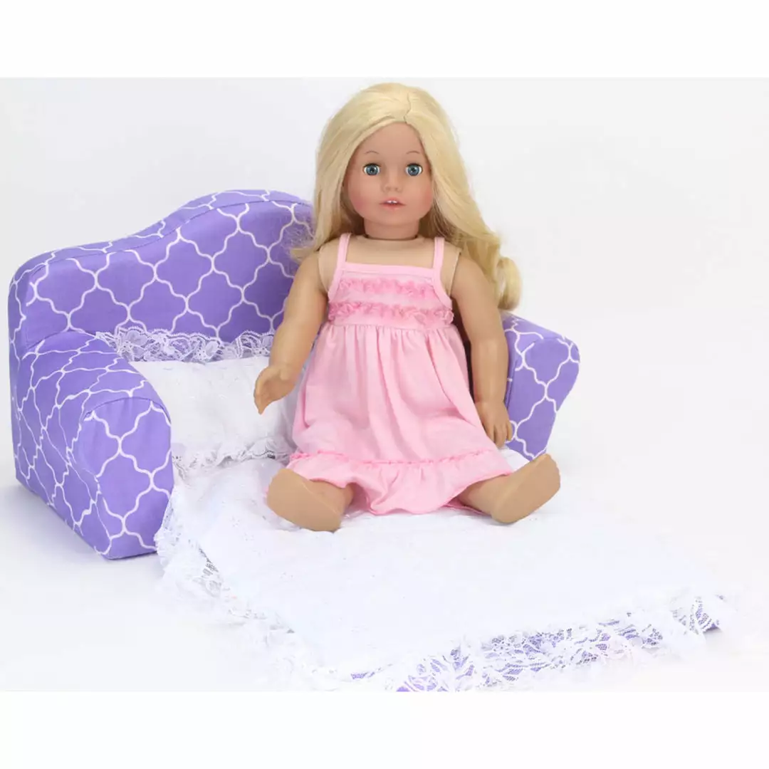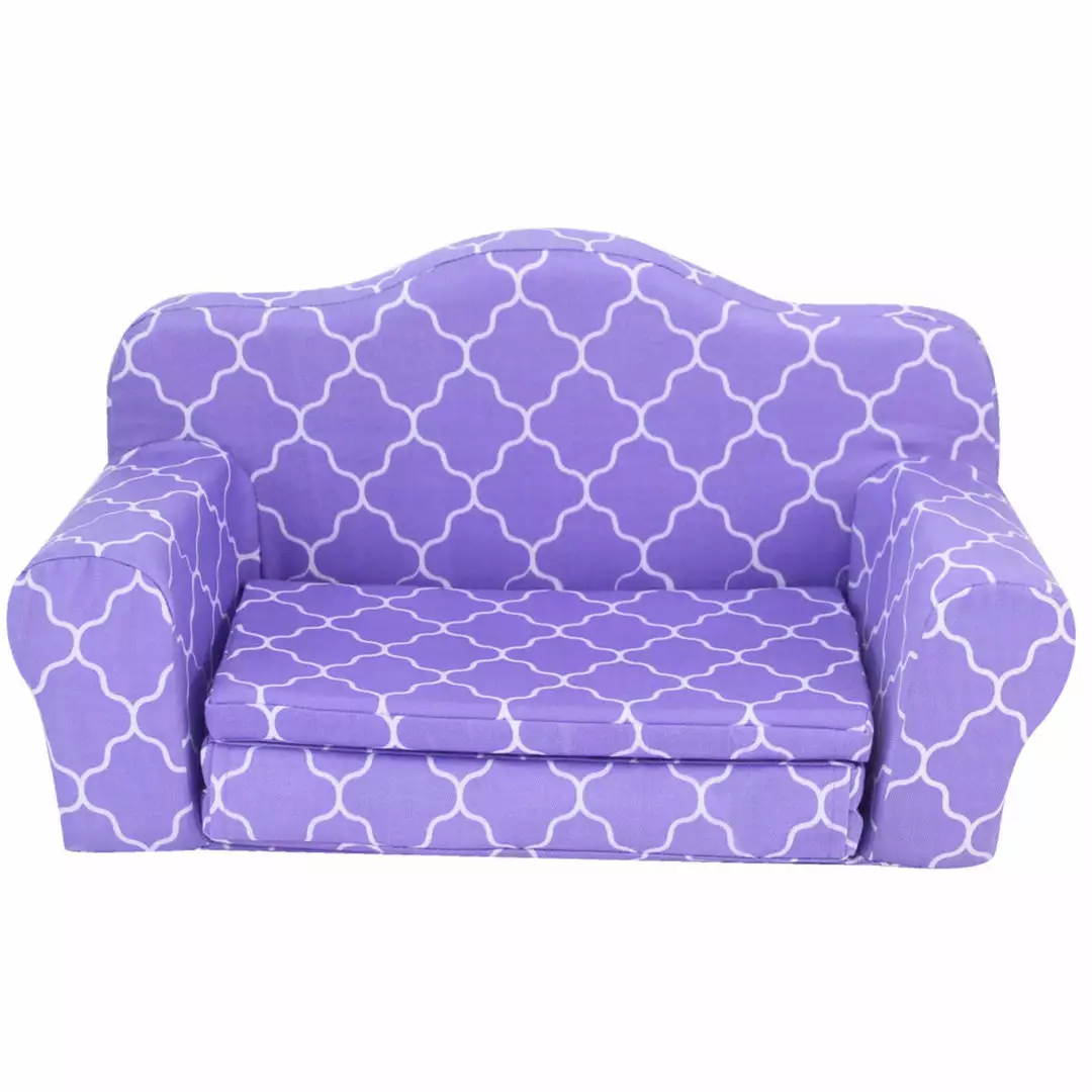 - DOLL PULL OUT SOFA BED: Plush sofa bed features a bright purple and white printed design to give your little one a stylish piece of furniture to play with