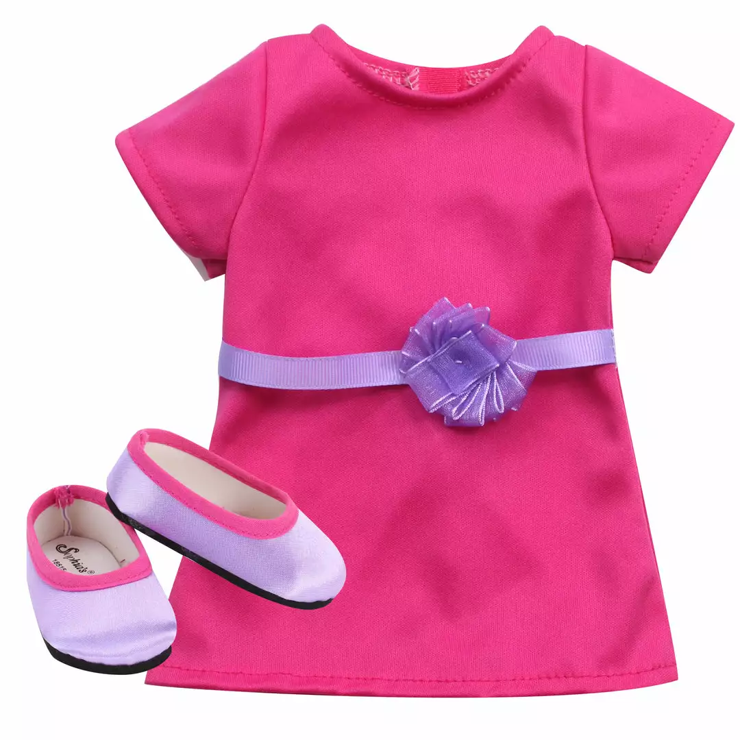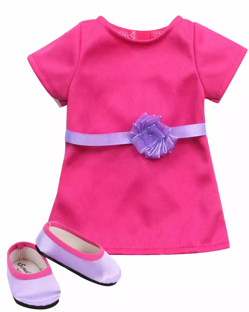 - HIGH QUALITY: Chloe is dressed in a hot pink tee shirt dress with purple sash belt and purple satin dress shoes with hot pink details. Underneath she is wearing a pair of white underwear.