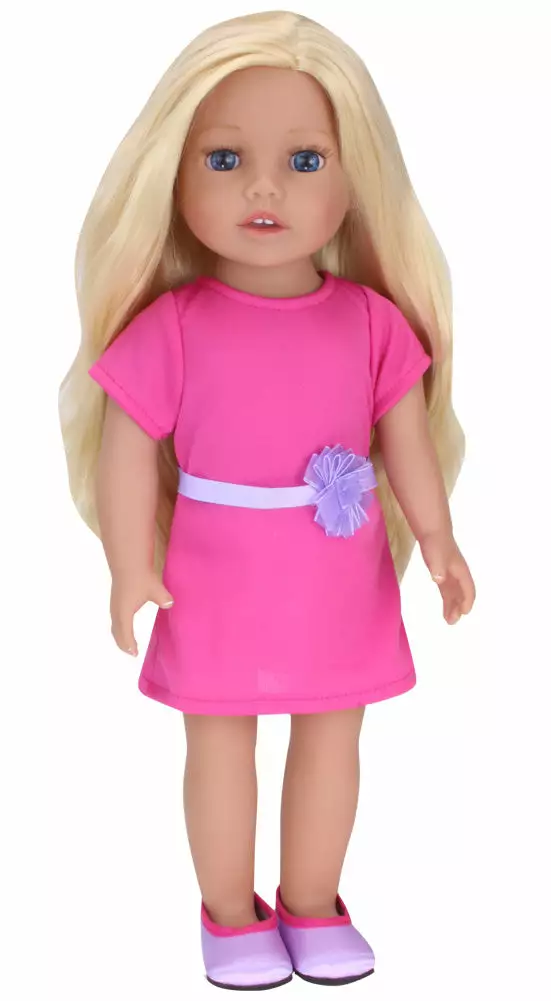 - INCLUDED: One 18 inch posable all vinyl doll wearing a hot pink dress and purple dress shoes complete this set.
