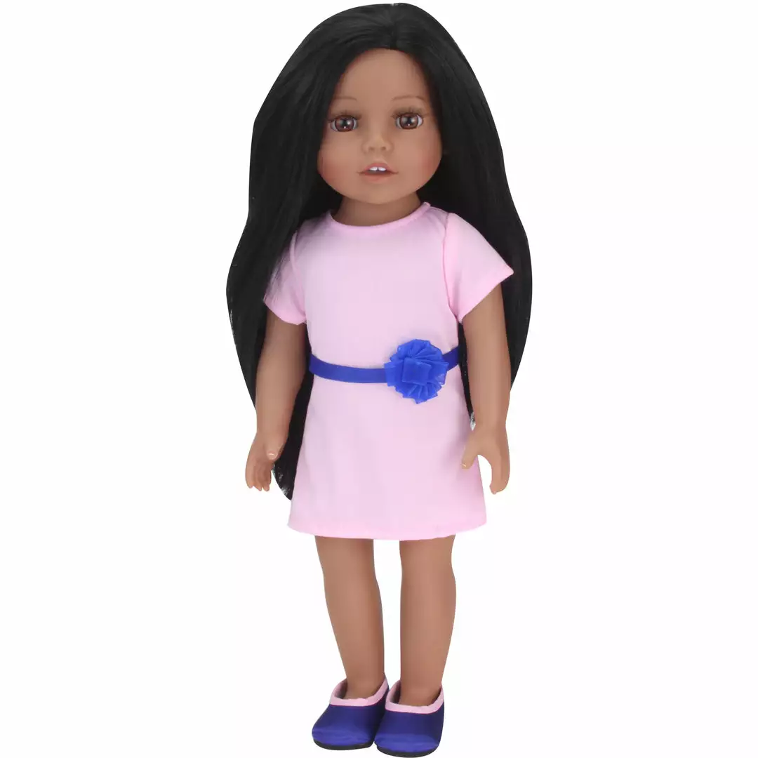 - INCLUDED: One 18 inch posable all vinyl doll wearing a light pink dress and navy dress shoes complete this set.