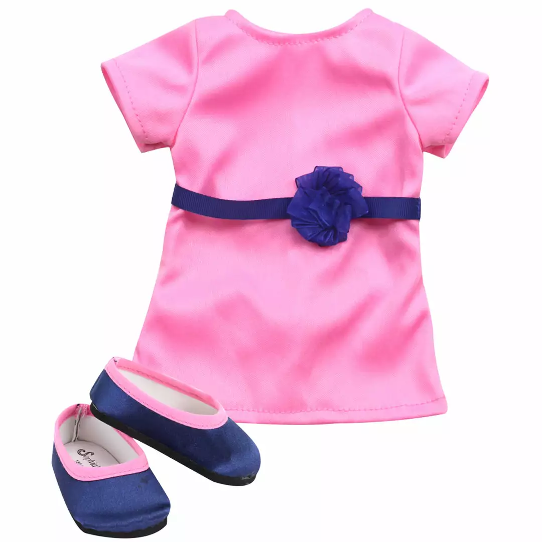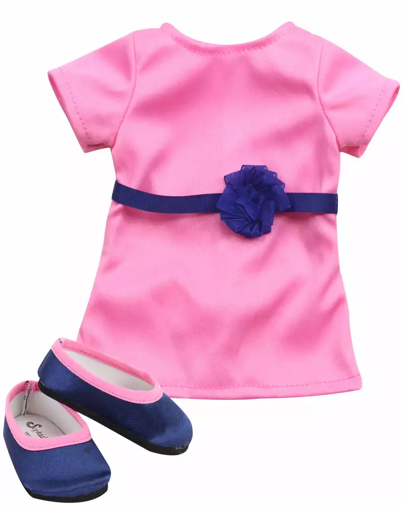 - HIGH QUALITY: Brooklyn is dressed in a light pink tee shirt dress with a navy sash belt and navy satin dress shoes with light pink details. Underneath she is wearing a pair of white underwear.