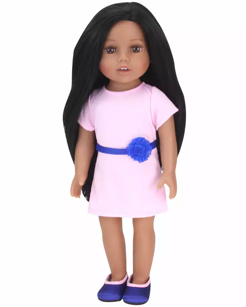 “Brooklyn” has long layered dark brown hair, brown eyes and stands 18 inches tall. She is a posable, all vinyl doll featuring soft eye lashes, rooted hair, subtle makeup and French tipped nails! Brooklyn is wearing a light pink dress with gray sash and gray satin ballet flat dress shoes with light pink trim, plus white underwear for a colorful outfit your little one will love. Sophia’s Everyday Friends Collection dolls are compatible with most 18 inch doll outfits and shoes and are sure to be your little one’s next best friend!