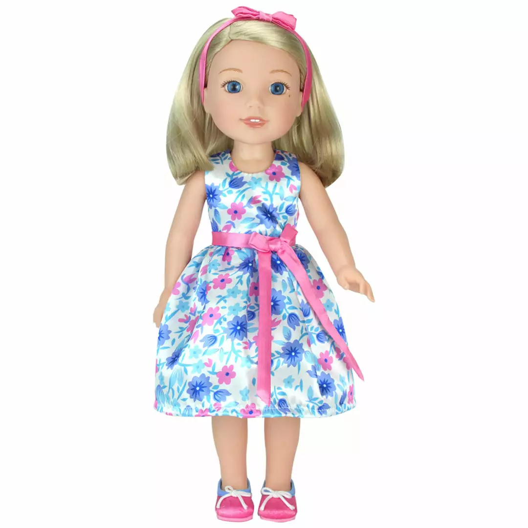 - INCLUDED: This dressy set includes a spring colored floral print satin dress with a pink satin sash, matching headband and satin flats sized for 14.5 inch dolls.