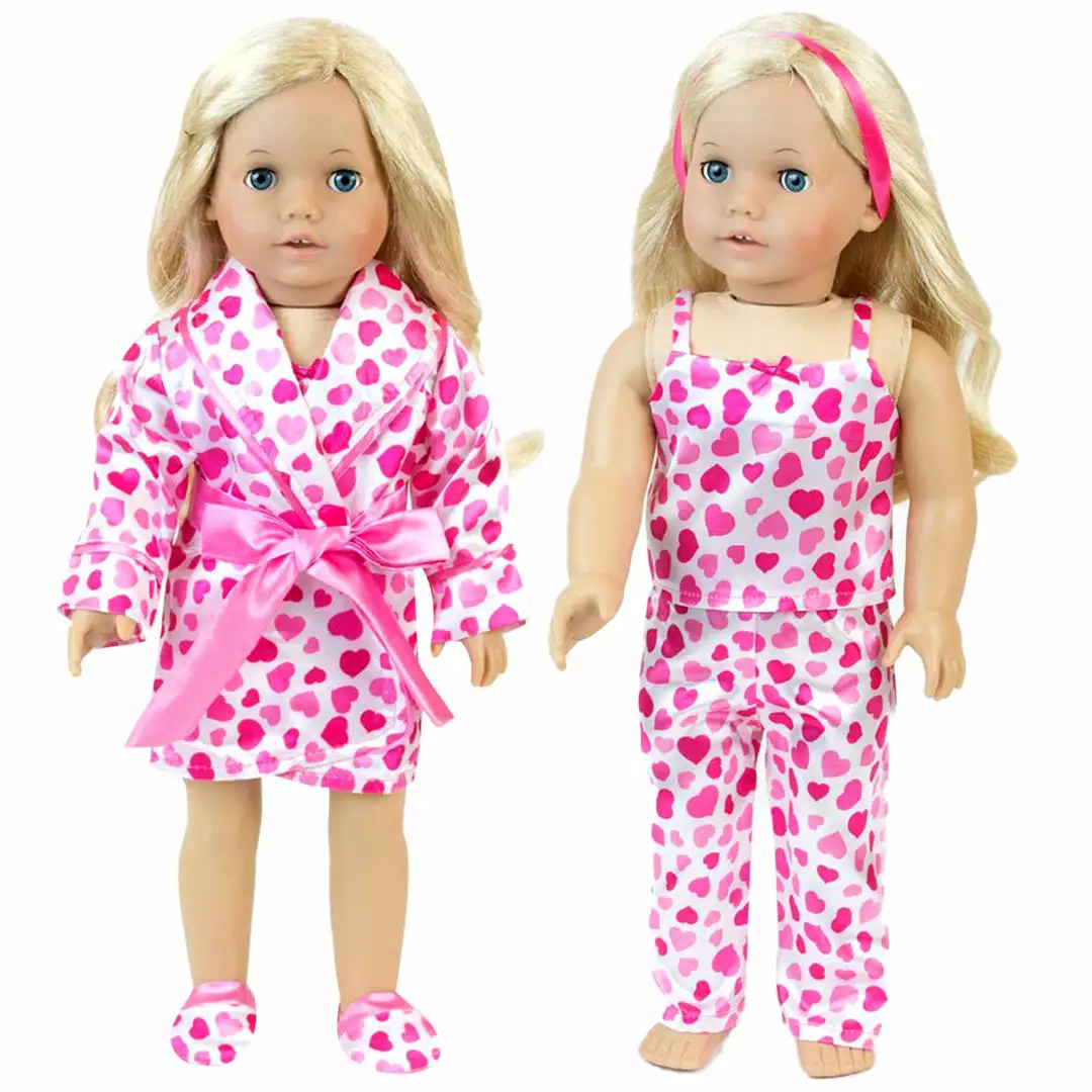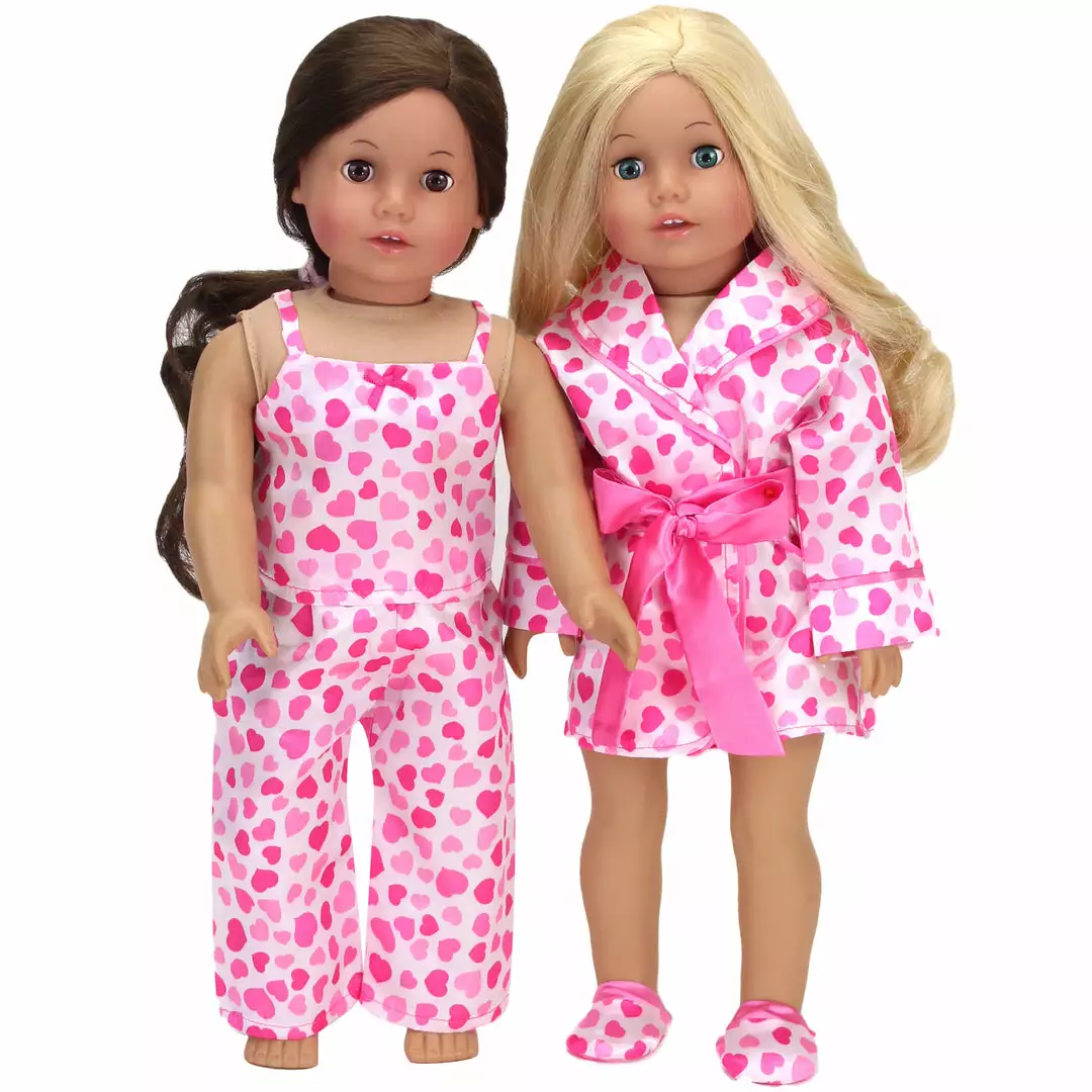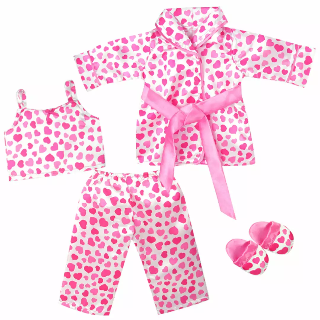 - INCLUDED: This 4 piece sleepwear set includes a top, bottom, robe and slippers for 18 inch dolls.