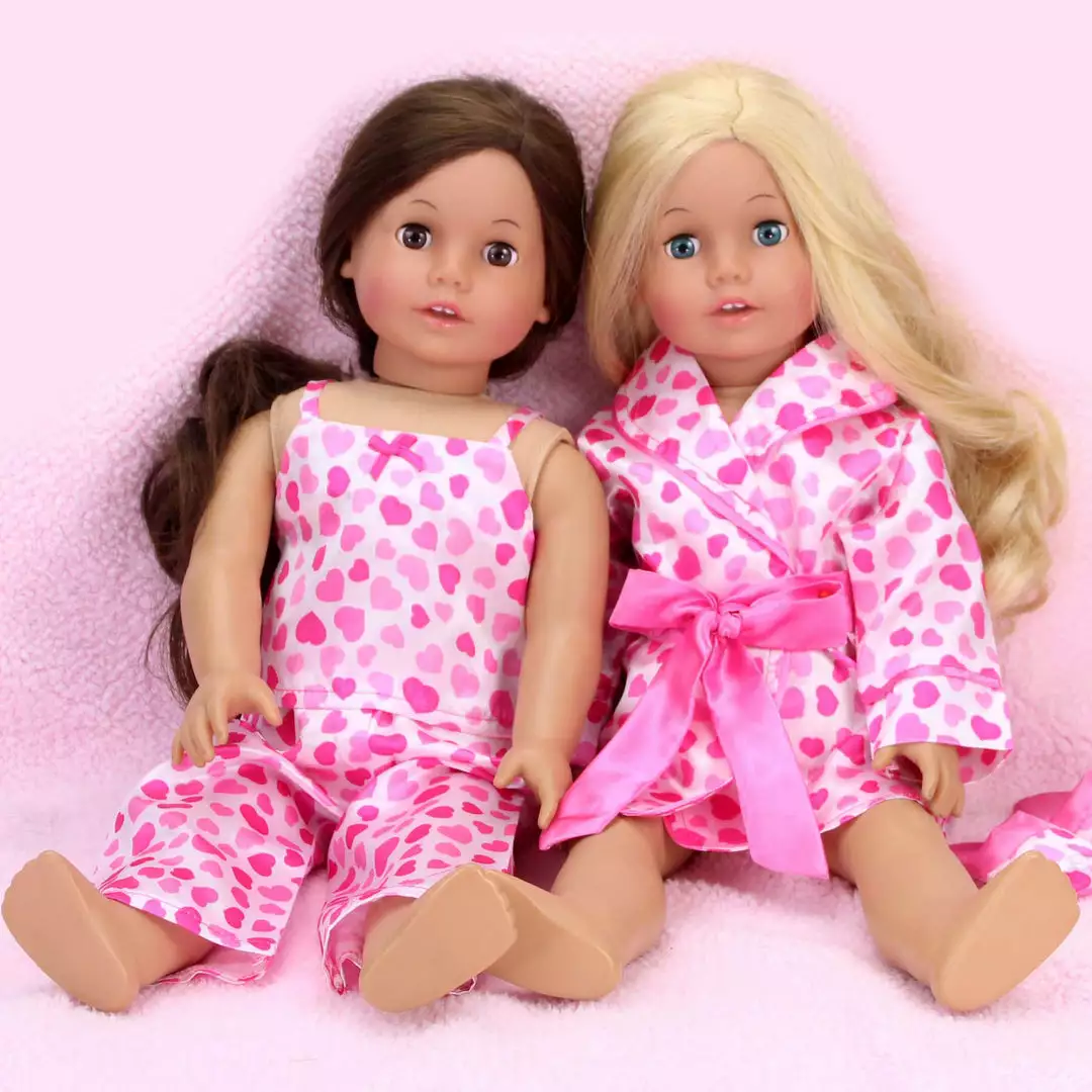 Provide your little one with a complete pajama set to dress their favorite doll in with Sophia’s by Teamson Kids Satin Heart Print PJ Set. This 4 piece set includes a white satin fabric covered in a hot pink and light pink heart print to so your little one’s doll will feel like a pampered princess. The tank top features a hot pink satin ribbon bow, and the pants include an elastic waistband. The long matching robe includes flat piping and a pink satin sash and the slipper feature a hot pink elastic strap to secure to the doll’s feet. This complete set has everything you little one needs to prepare their favorite 18 inch doll for bed, or can be used for two dolls who love to match! Made for 18″ dolls, the set is compatible with Sophia’s dolls, American Girl dolls, My Life As dolls, Our Generation dolls, and more! Dolls not included.