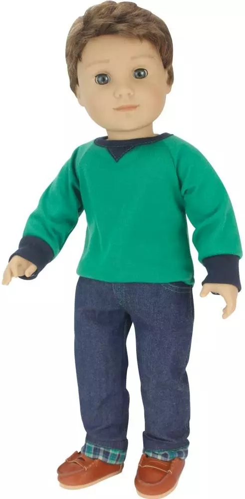 Give your little one fun clothes for dressing up their boy doll with the Sophia’s by Teamson Kids Shirt, Jeans, and Penny Loafers Outfit. This complete 3 piece set includes a green long sleeve shirt with blue trim, flannel cuffed jeans with green stitching, and cognac brown penny loafers for a cozy, stylish outfit your little one’s doll will love. These trendy accessories encourage your child to use their imagination while playing pretend. Plus, the complete casual style outfit allows your little one to easily accessorize their boy or girl dolls with a laid-back look. Made for 18″ dolls, the set is compatible with Sophia’s Dolls, My Life As dolls, Our Generation dolls, and more! Dolls not included.
