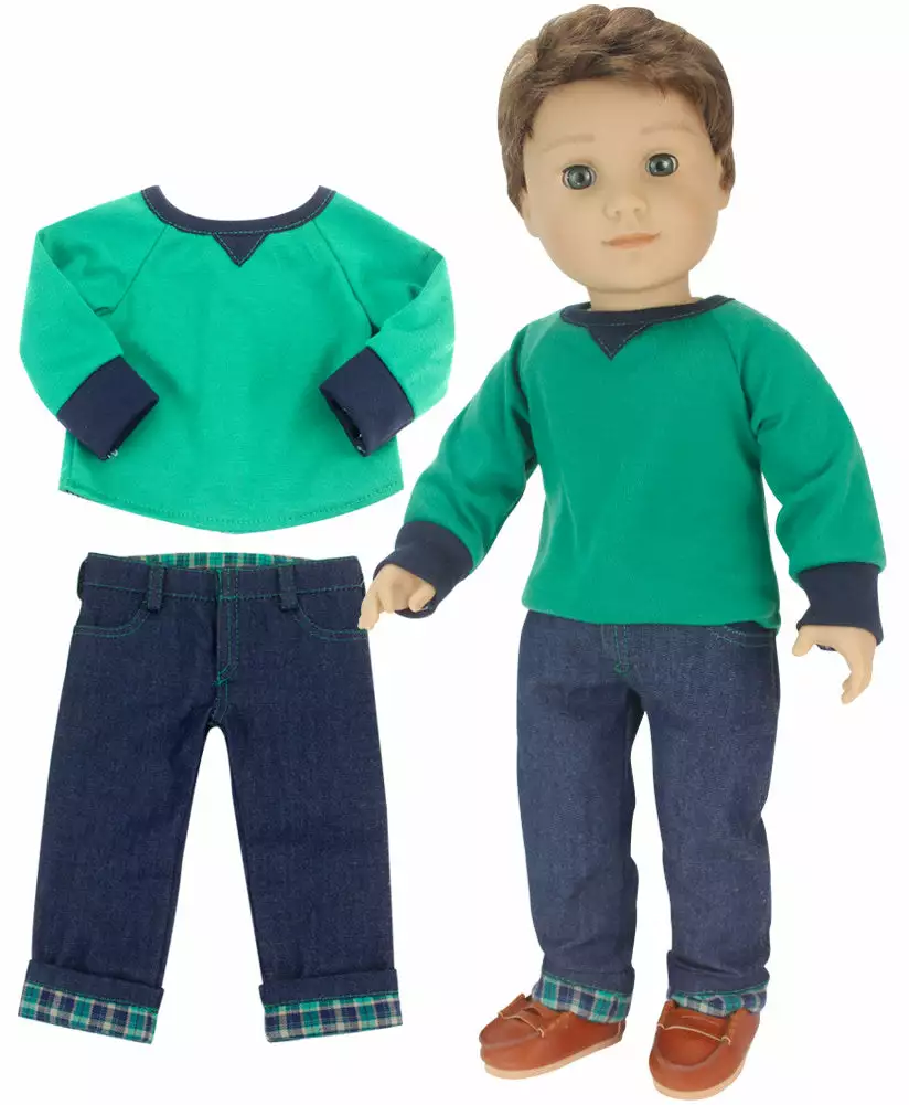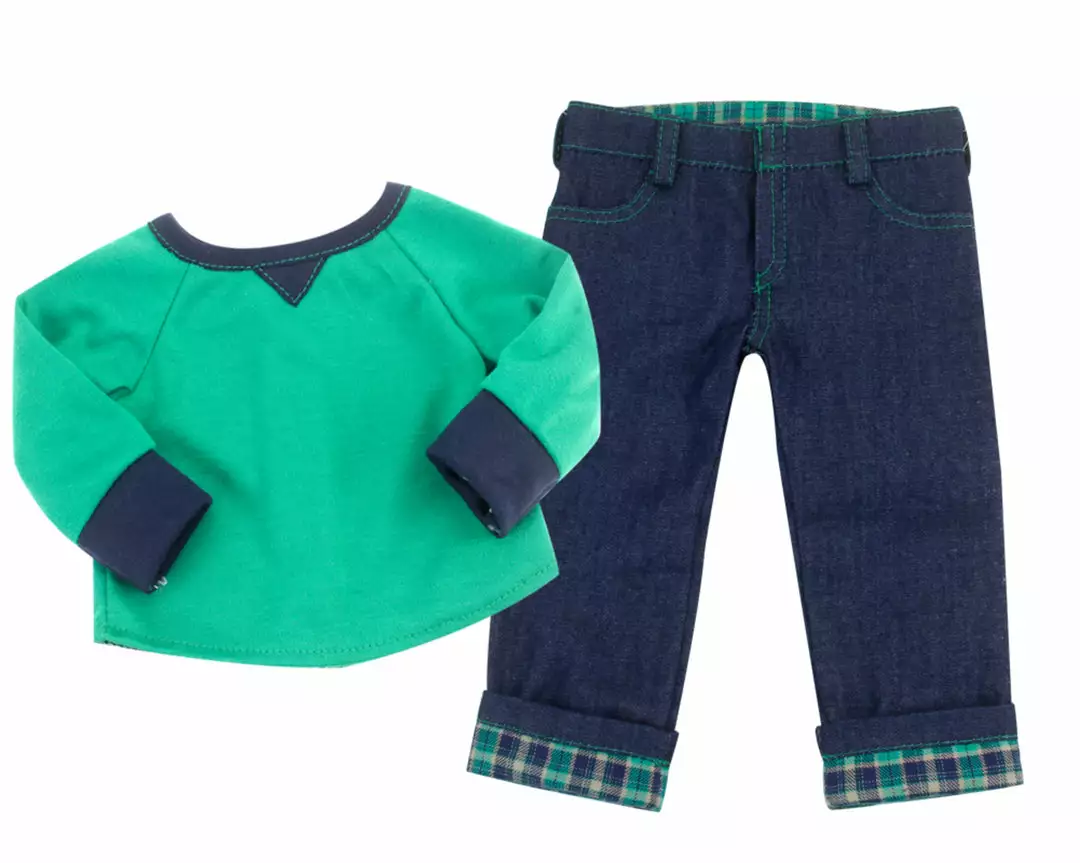 - DOLL CASUAL OUTFIT SET: Includes a green long sleeve shirt, flannel cuffed jeans with green stitching, and cognac brown penny loafers for a colorful, stylish outfit